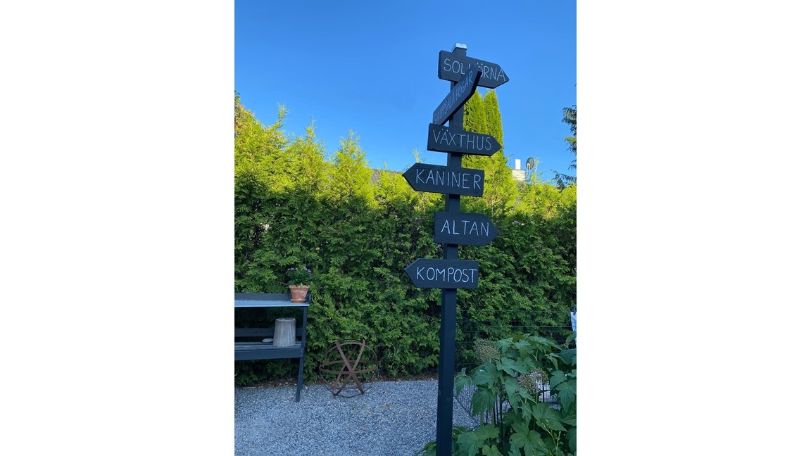 Olika trädgårdsrum, egenbyggt ”växthus”, grus