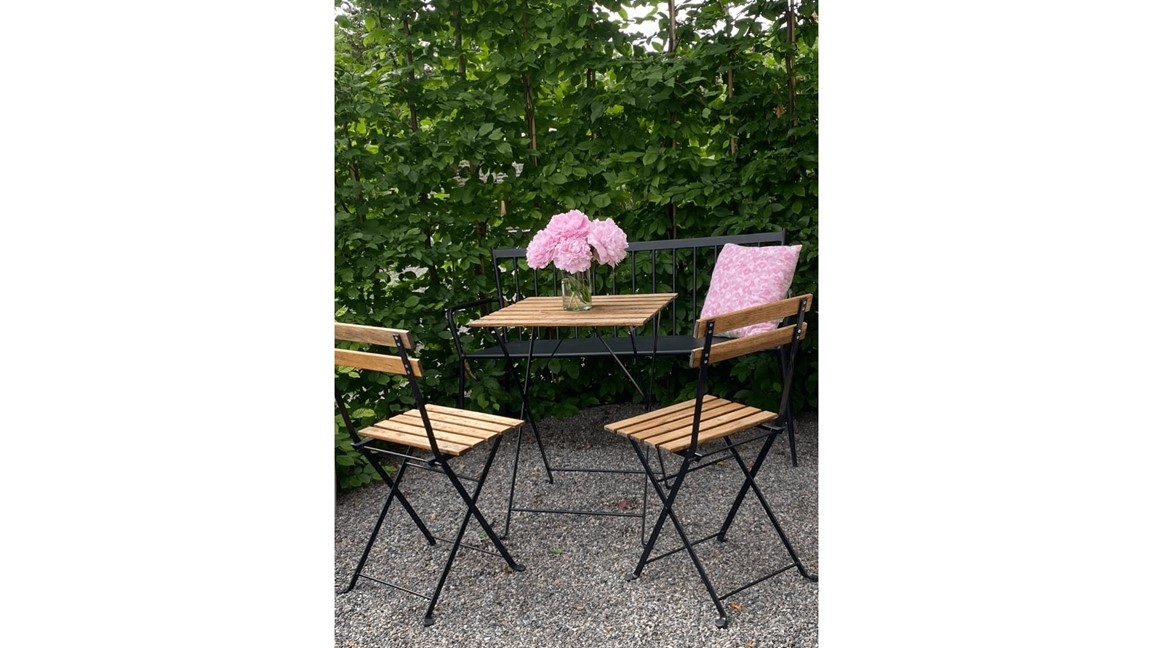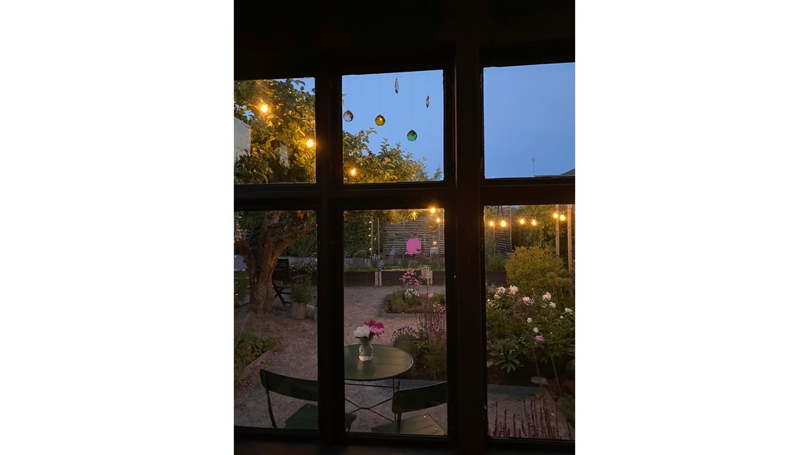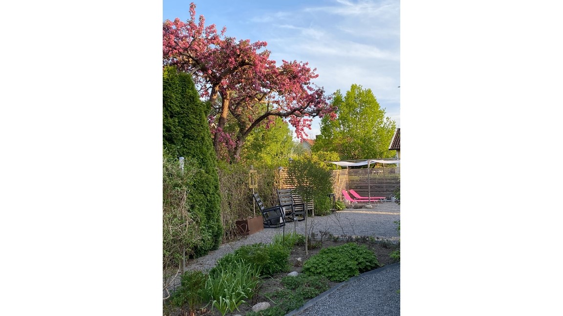 Utifrån vägen ser man inget av trädgården, men när man följt vår lilla skaftväg och passerat genom carporten kommer man in i vår oas.