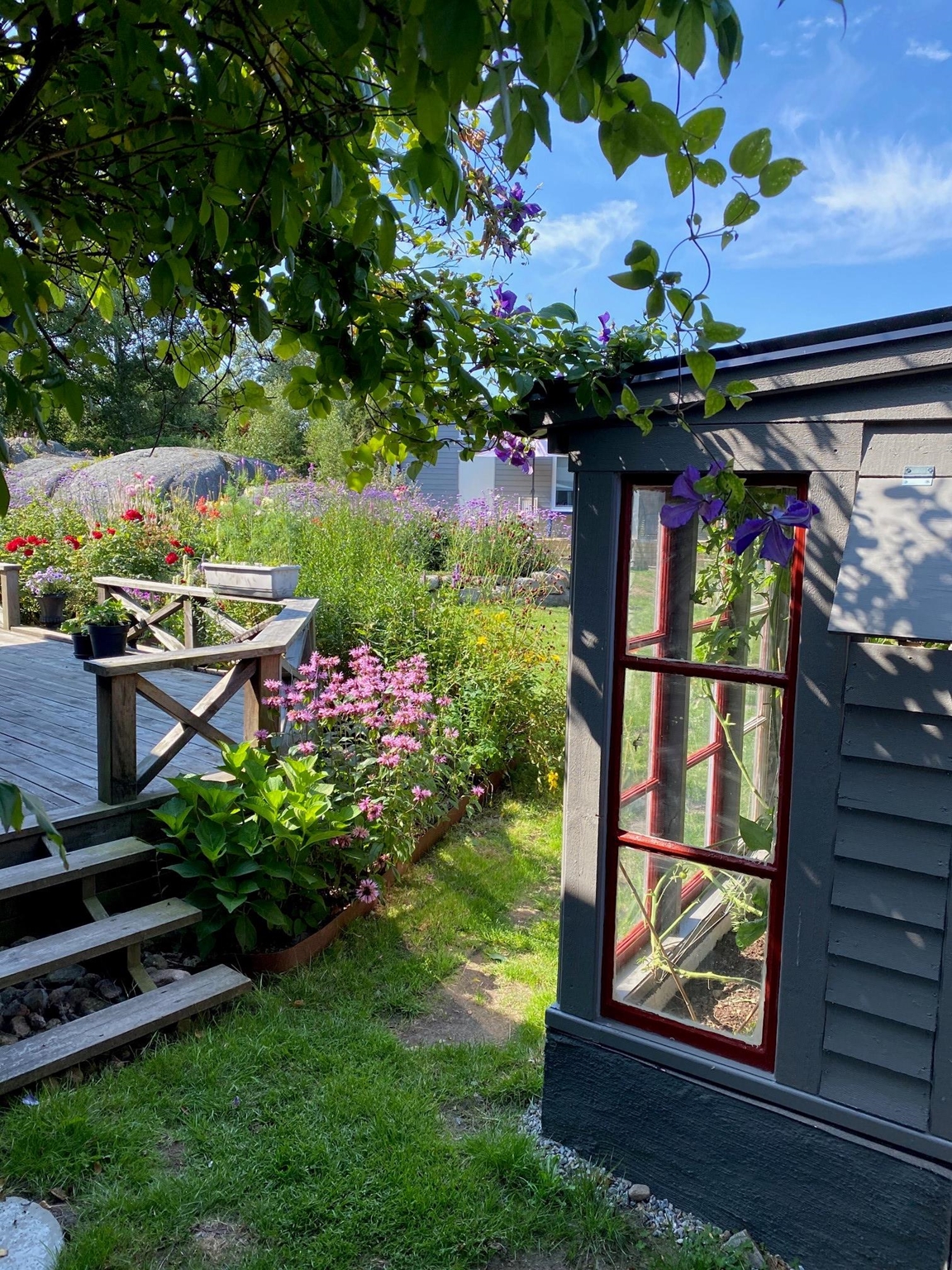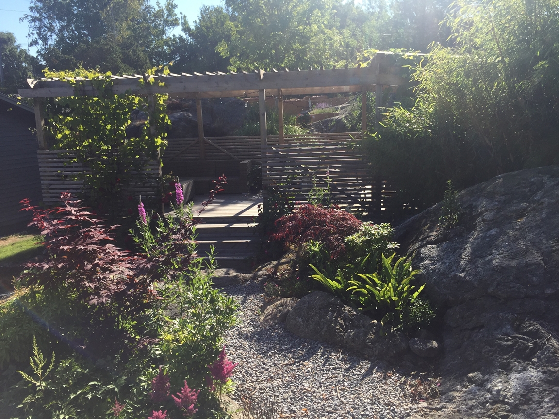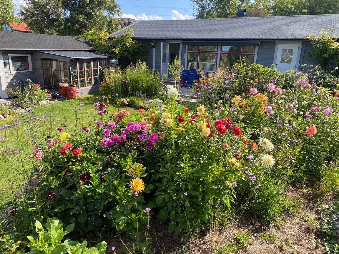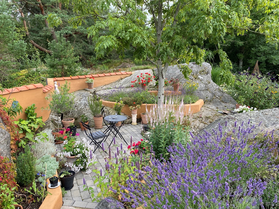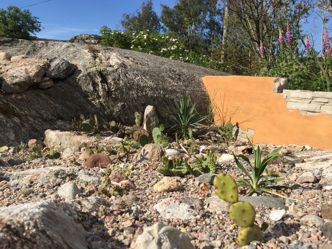I vår sommarstuge-trädgård på ön Lyr, mellan Orust och Tjörn, skapar vi tillsammans sedan 2015. Vi försöker föra omvärlden lite närmare vår egen, men vi är inte alltid helt överens och kanske är det därför resultatet blir kreativt och oväntat. Här möter bohuslänska stenmurar blommande kaktusar från Nordamerika, en liten piazza med känsla av medelhavet, en japansk del och en lejonklippa med inspiration från Afrika.