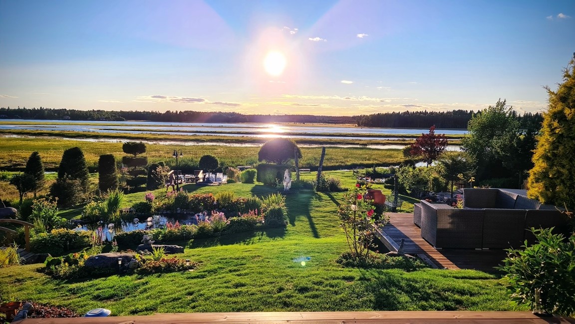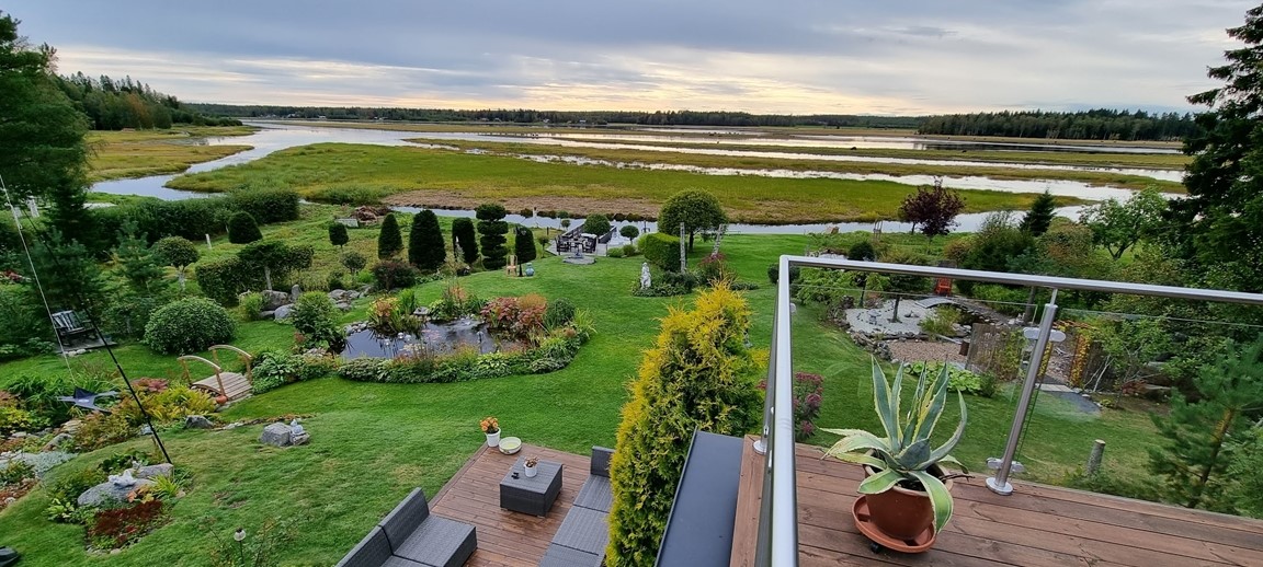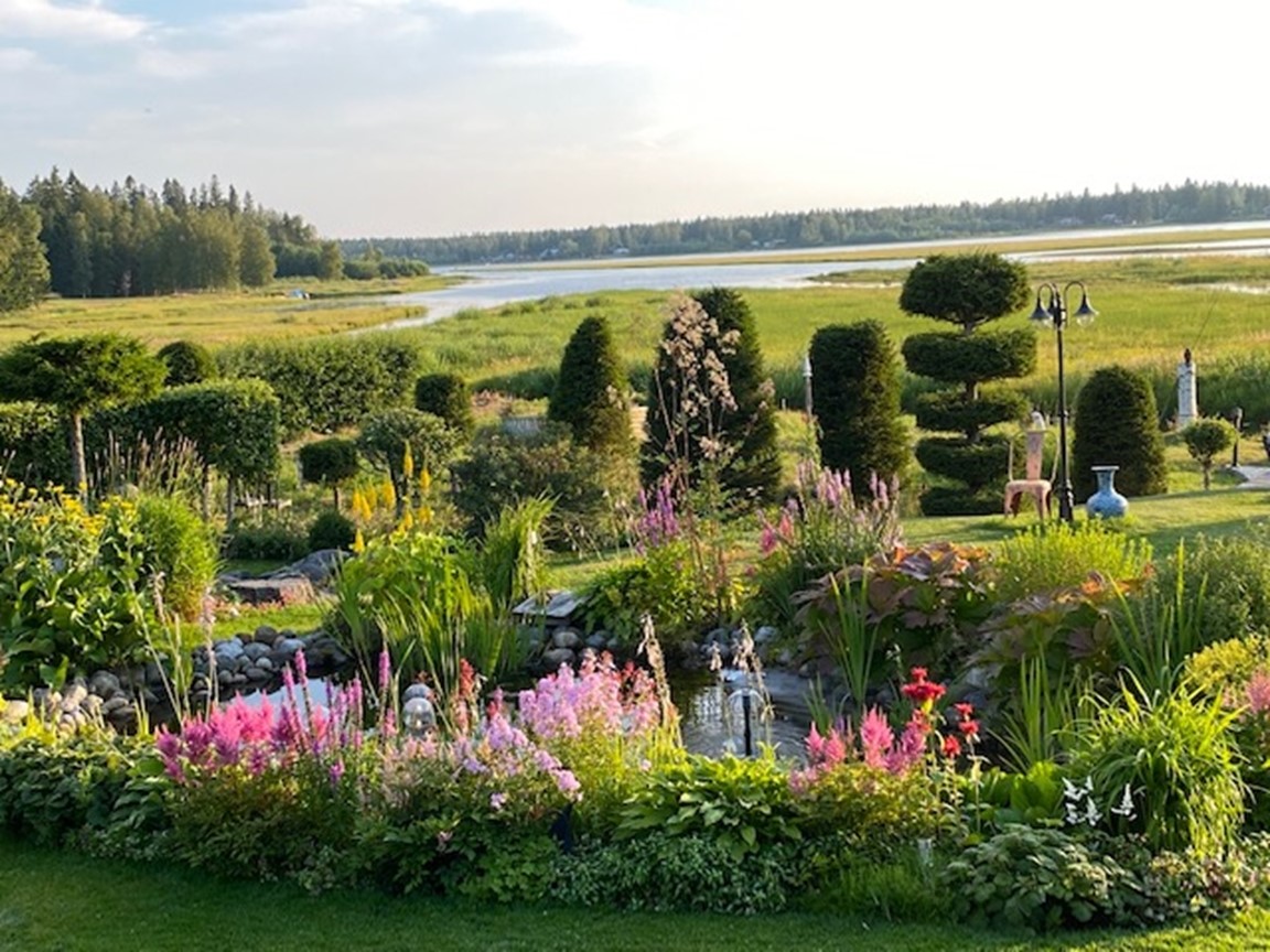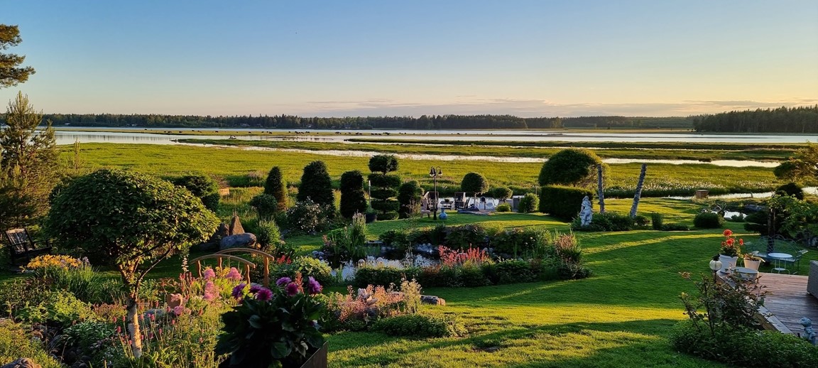 Vid Umeåälvens delta ligger denna kuperade strandtomt med utsikt över naturskyddsområdet vid Västerfjärden. Här kan du promenera bland perenner, flätade och formklippta träd, sten, trädgårdsfigurer, broar, bäckar och dammar. Här kan du inspireras av svensk sommaridyll även Italien och Japanska rummen.