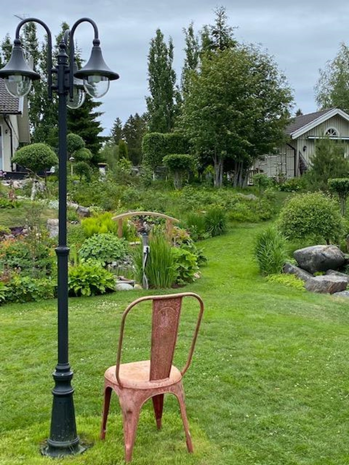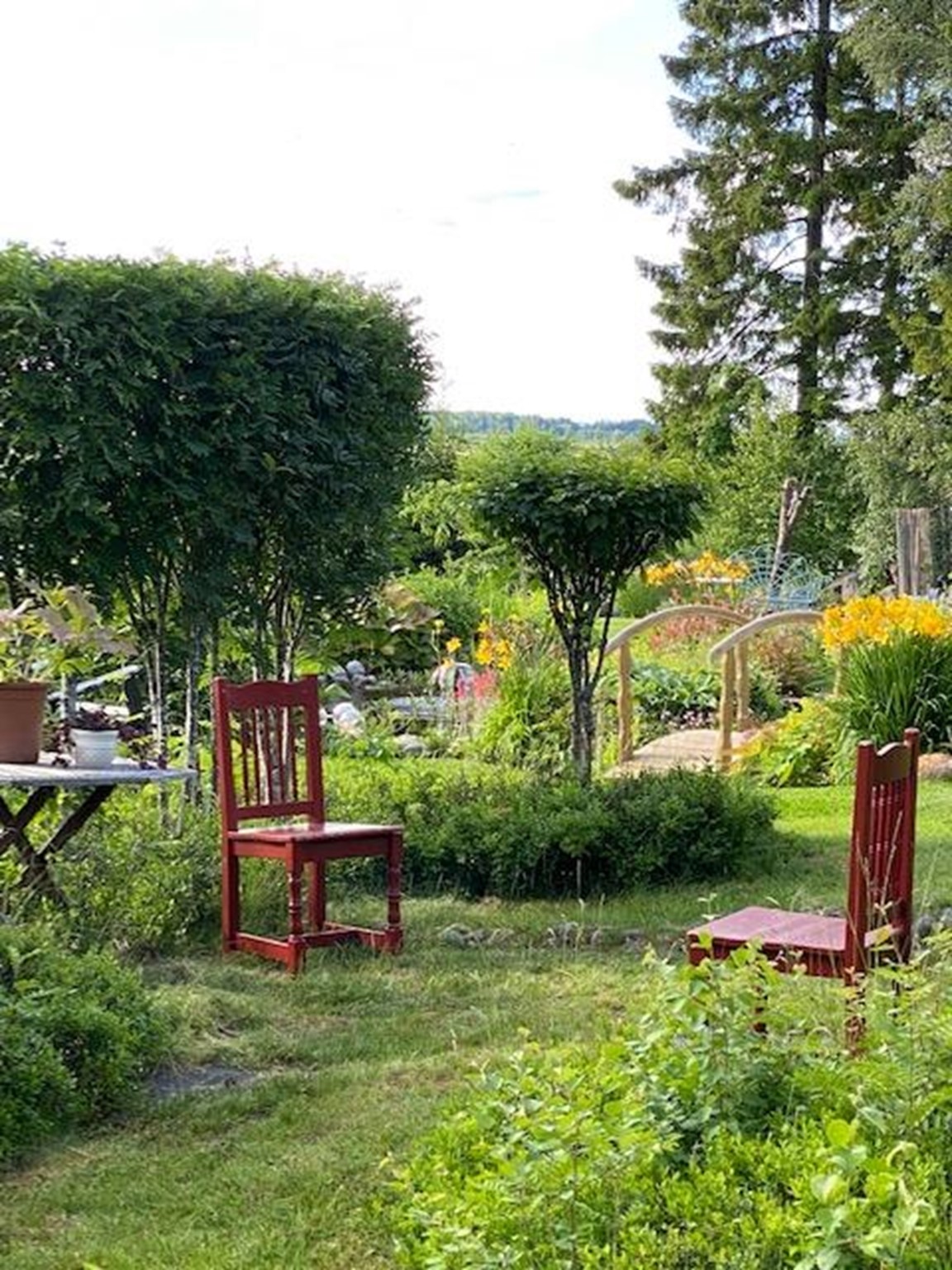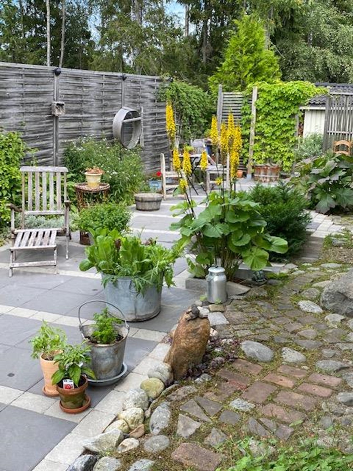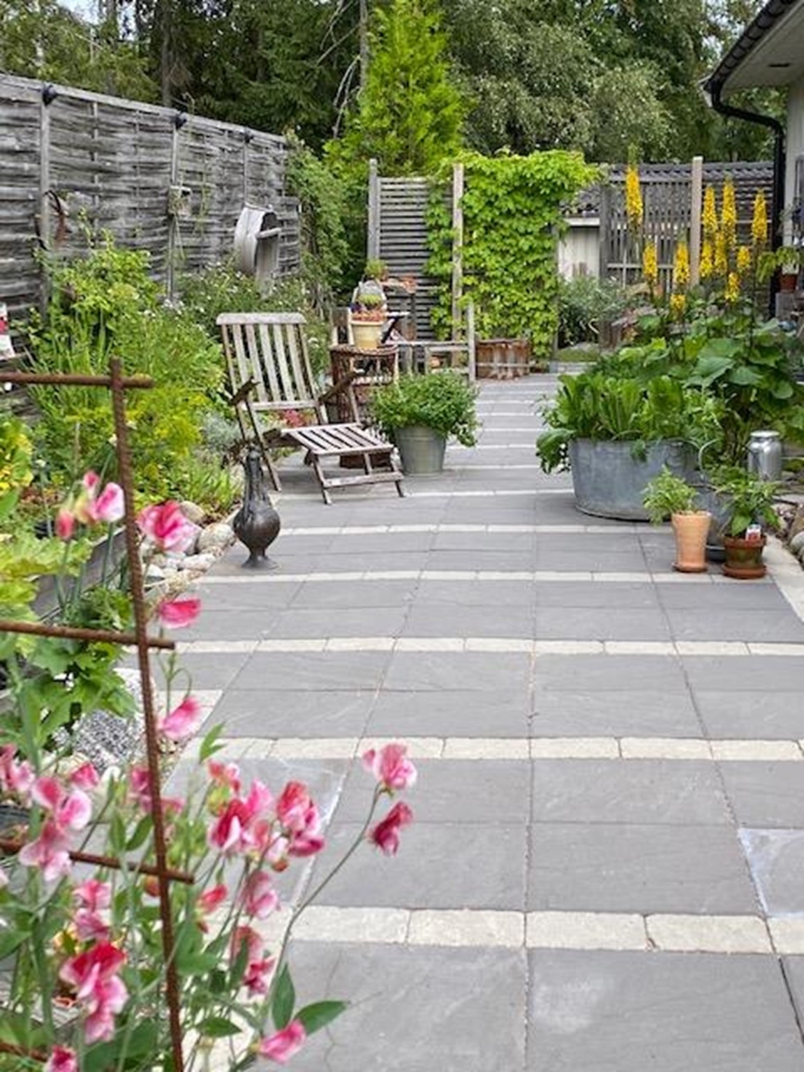 Trädgårdens många sittplatser ger dig möjlighet att sitta ned och njuta.