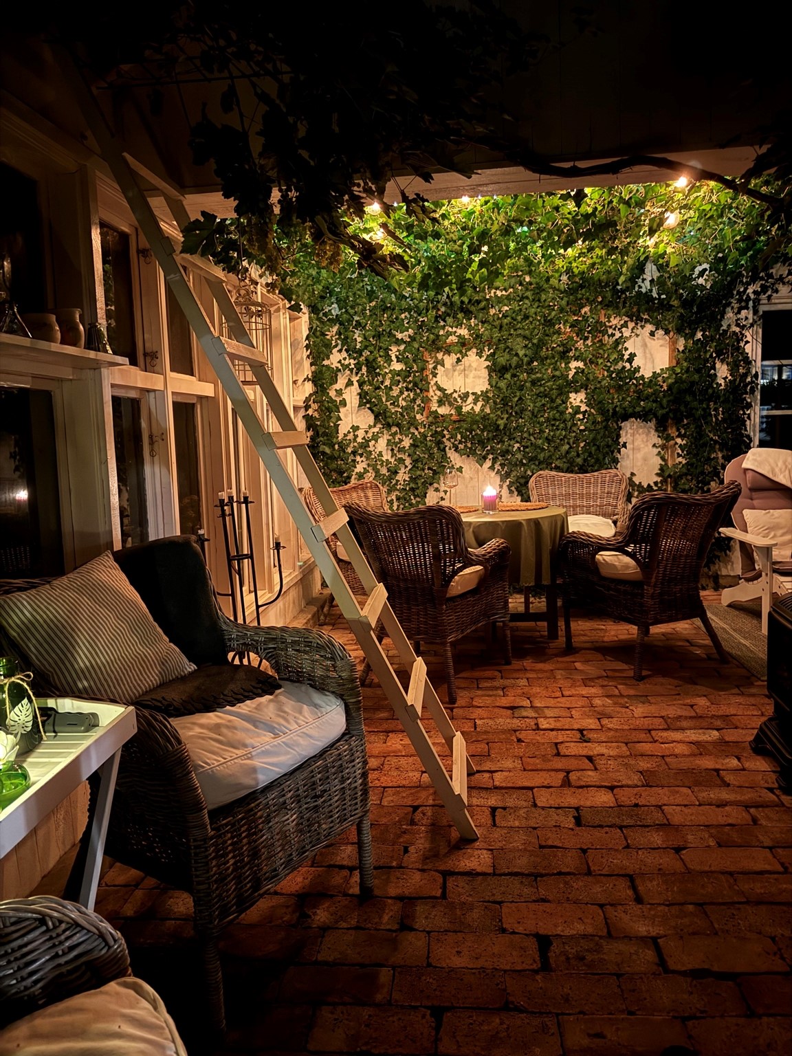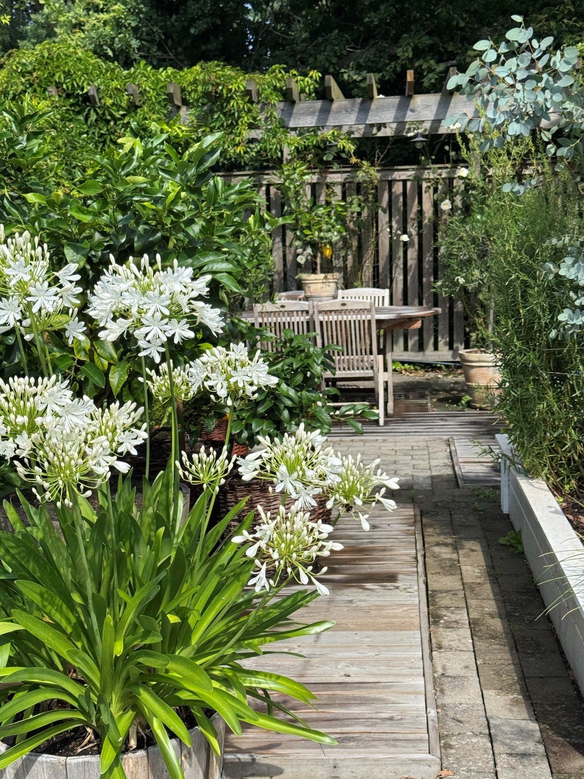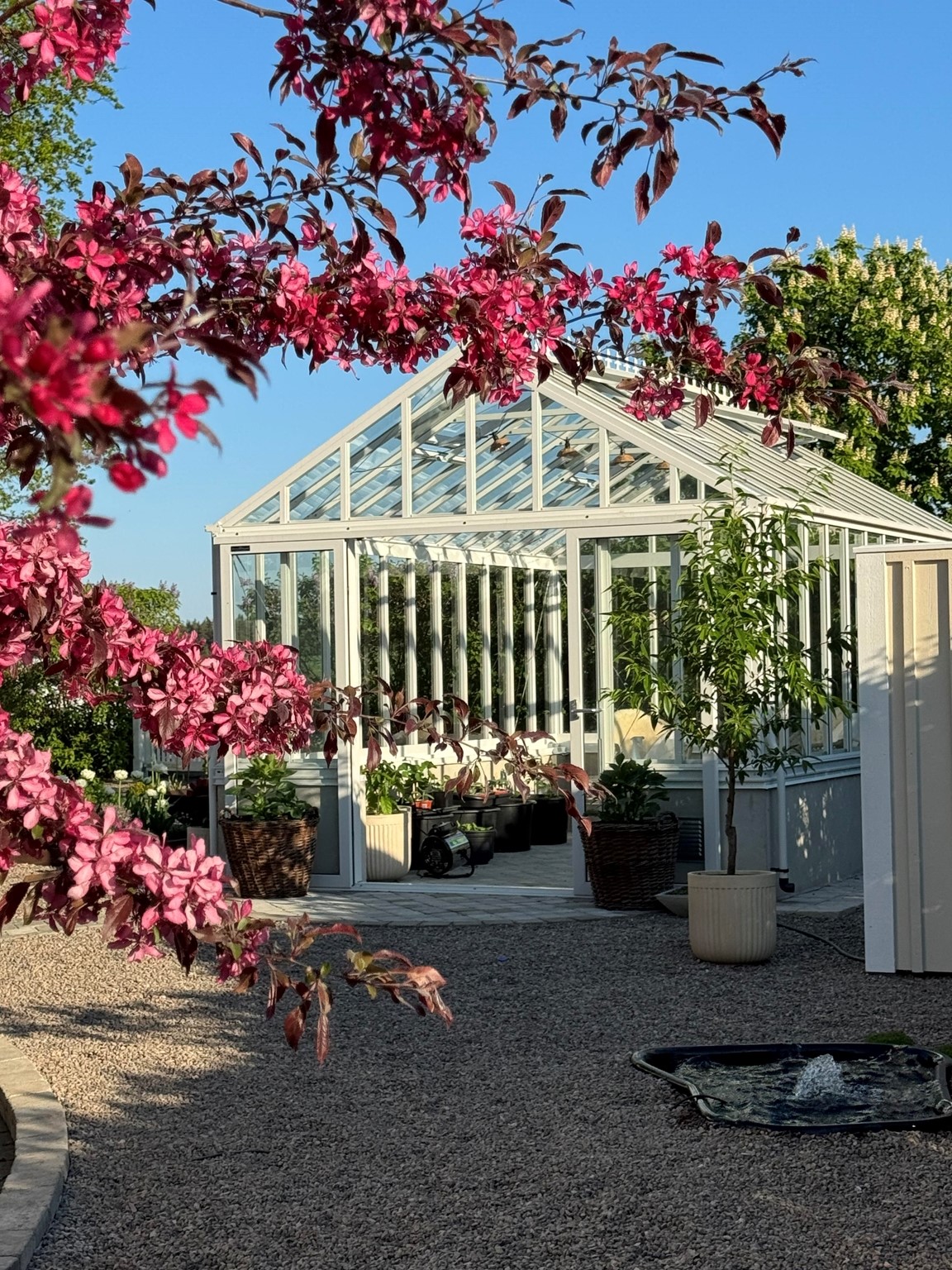 Vårt orangeri fungerar som uterum på sommaren. Där finns bl a en vinranka och olivträd. På hösten sätts alla våra medelhavsväxter in där för sin vinterförvaring.