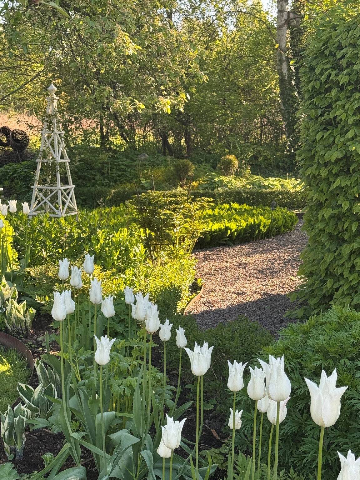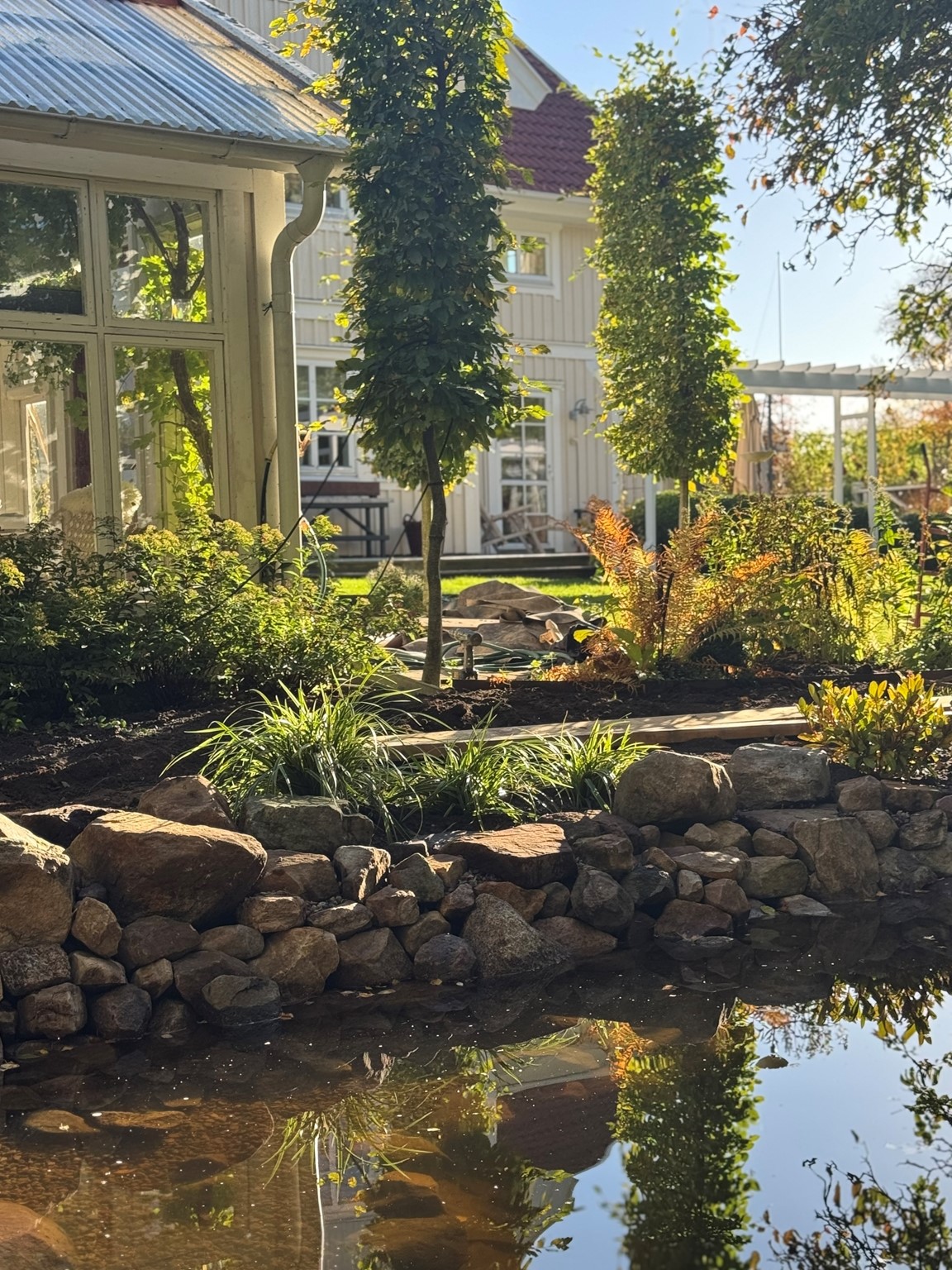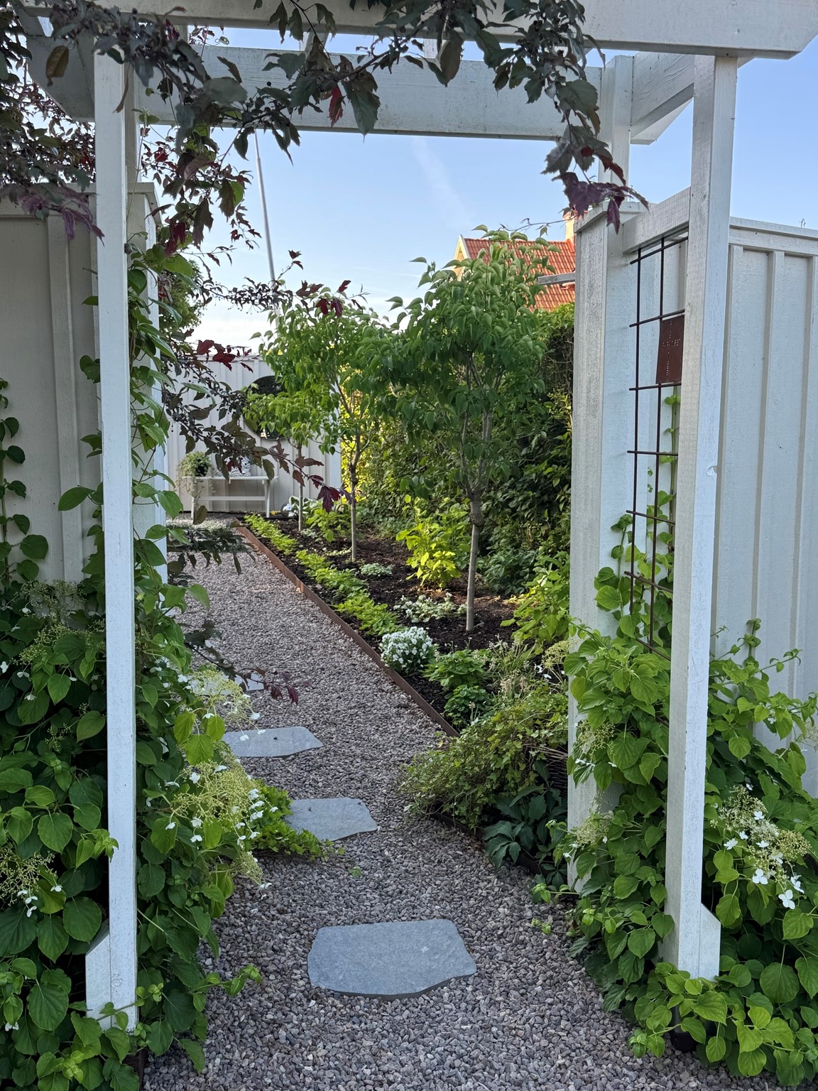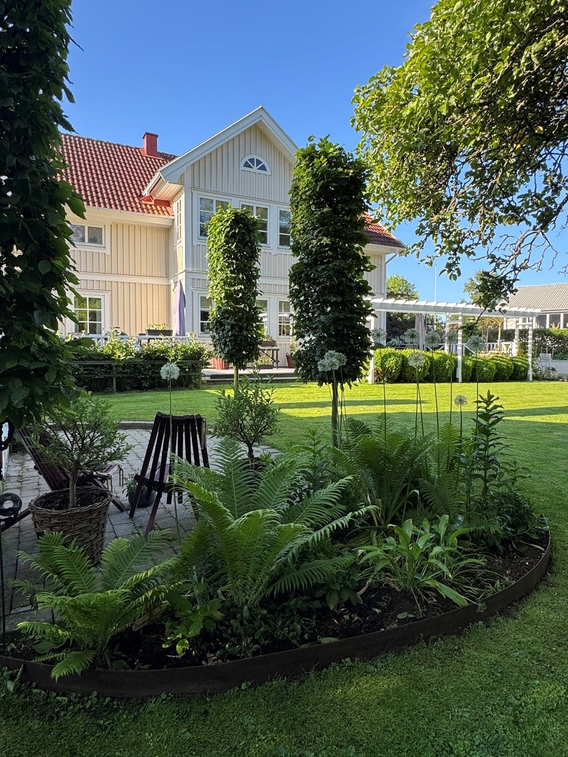Vi har en hobbyträdgård som är i ständig förändring, en levande och romantisk trädgård med flera olika rum som binds ihop med grusgångar. Det finns många sittplatser som vi ofta nyttjar. För oss är det viktigt att kunna stanna upp och njuta av det vi skapat.