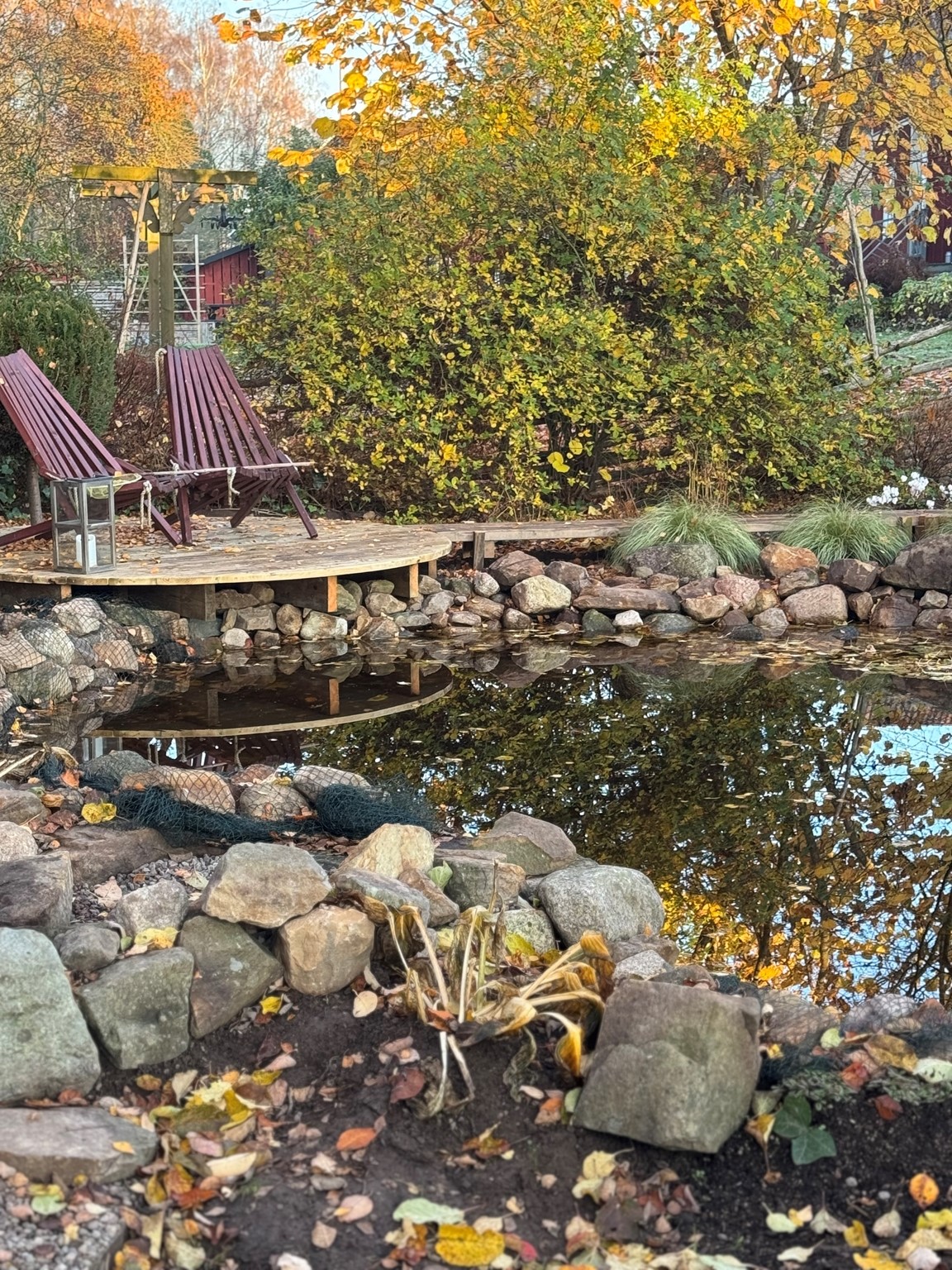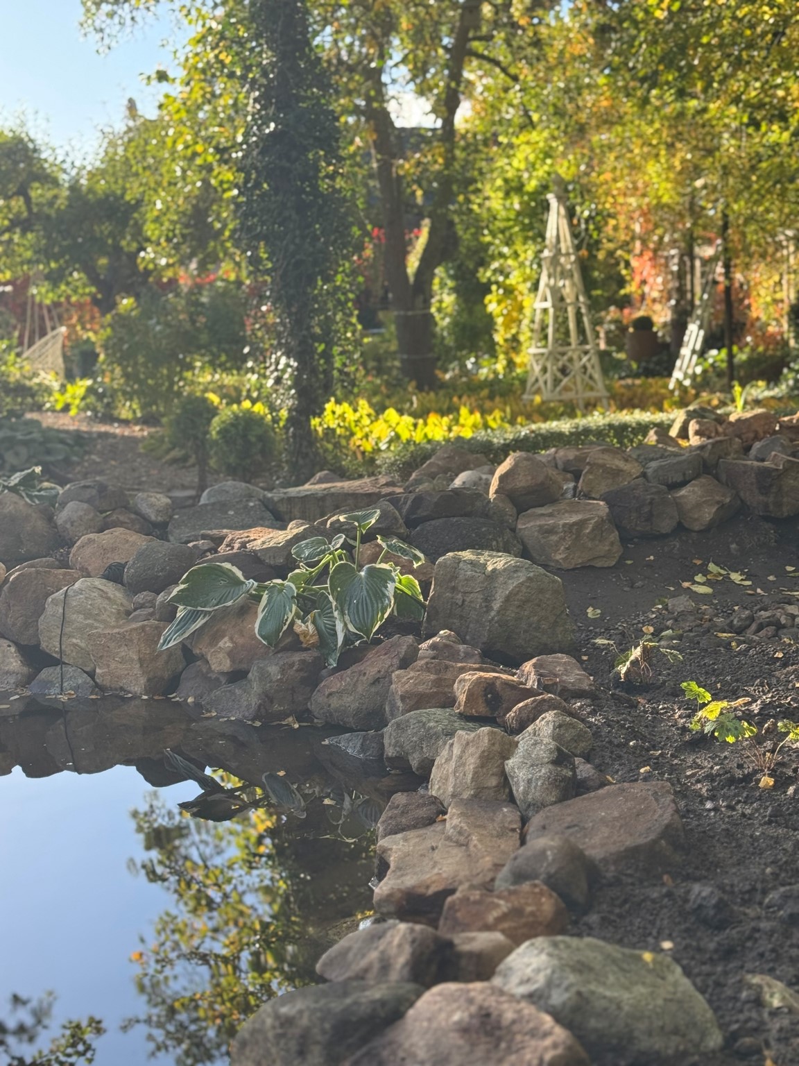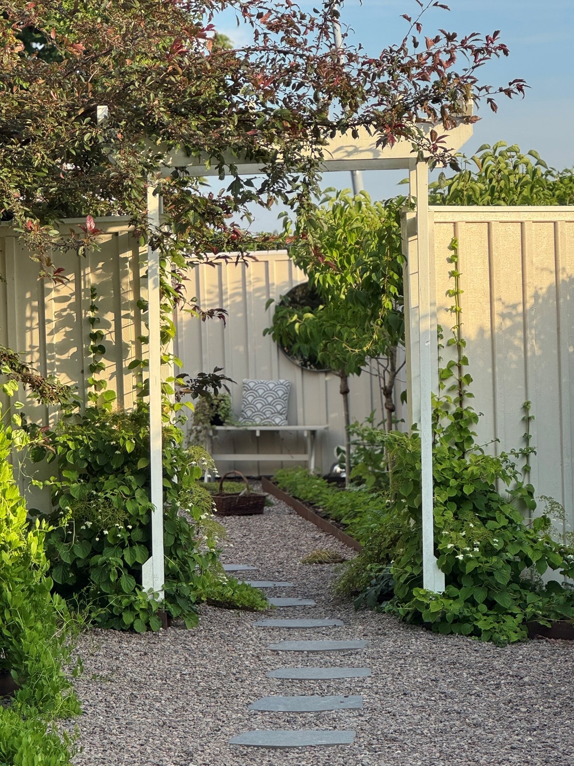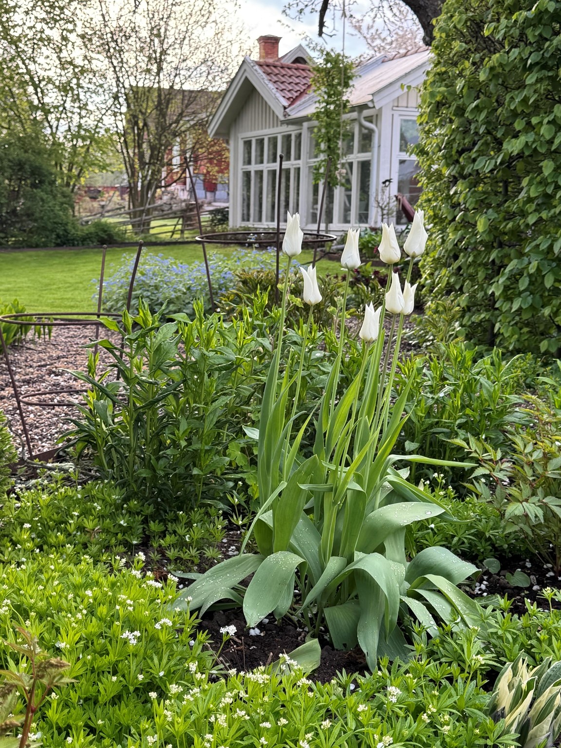 Vi har en hobbyträdgård som är i ständig förändring, en levande och romantisk trädgård med flera olika rum som binds ihop med grusgångar. Det finns många sittplatser som vi ofta nyttjar. För oss är det viktigt att kunna stanna upp och njuta av det vi skapat.