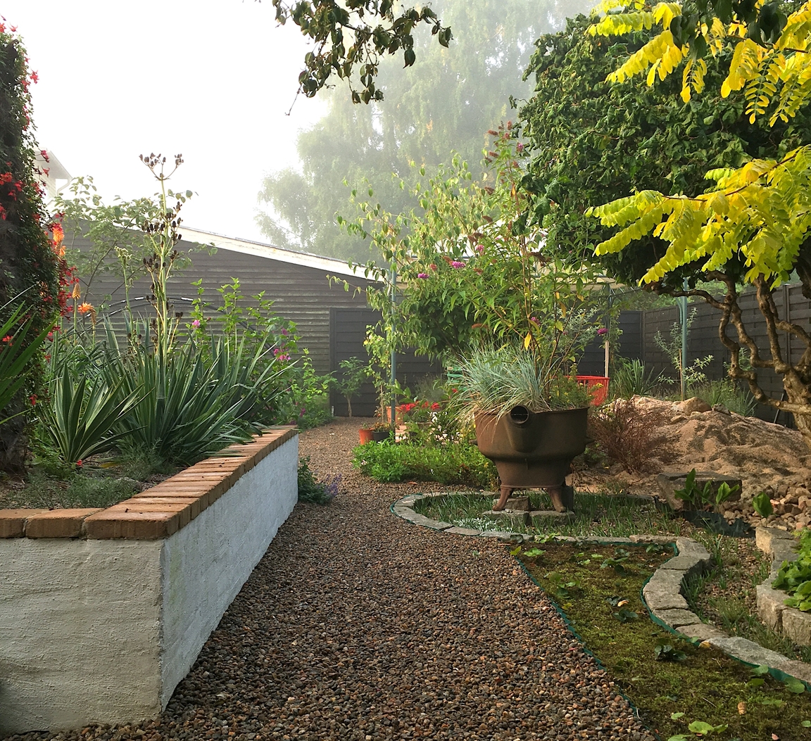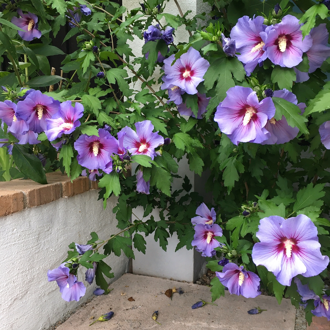 Den 700 kvm lilla trädgården har inslag kvar från 1950-talet, men en nystart gjordes av oss 2017. Sedan dess har skepnaden förändrats, ett arbete som fortfarande pågår. Senaste tillskottet är en häck av blåblommande hibiskus utmed gatan.