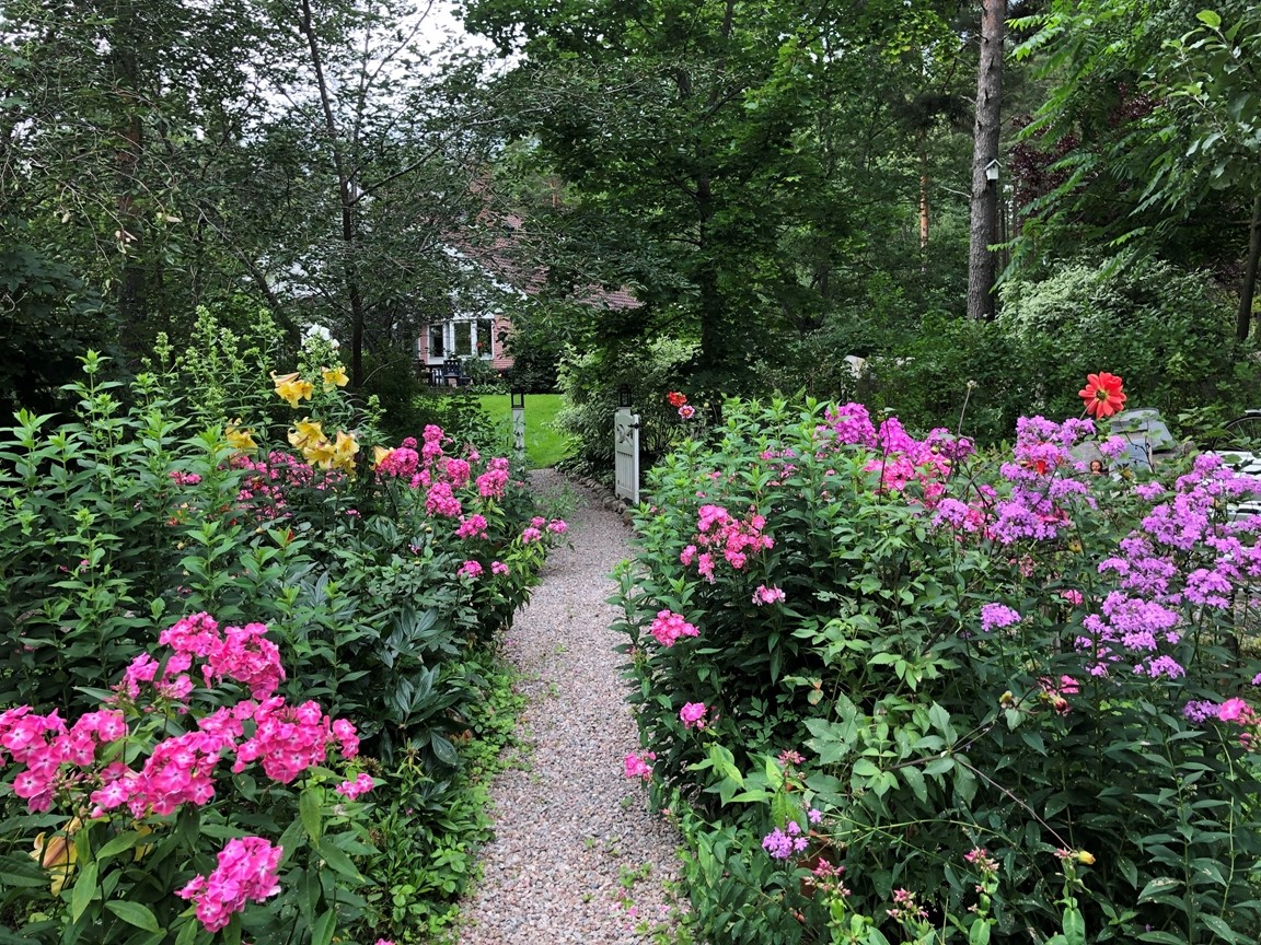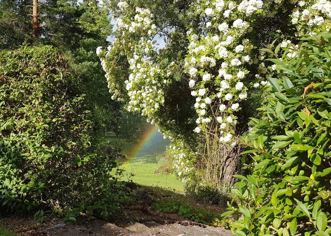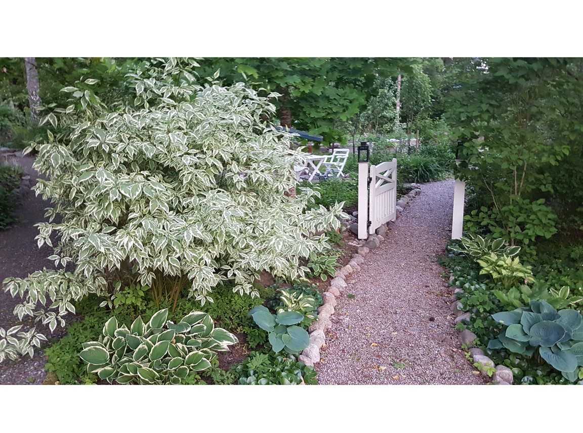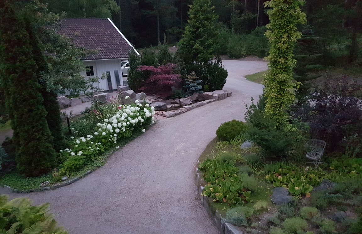 Rofylld ca. 3000 m2 anlagd trädgård med stora & små rum avdelade med buskar och häckar.