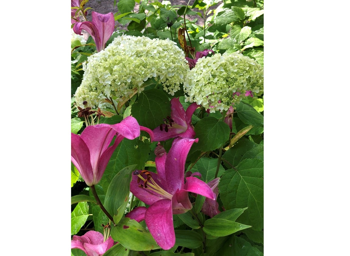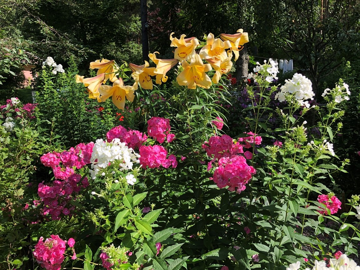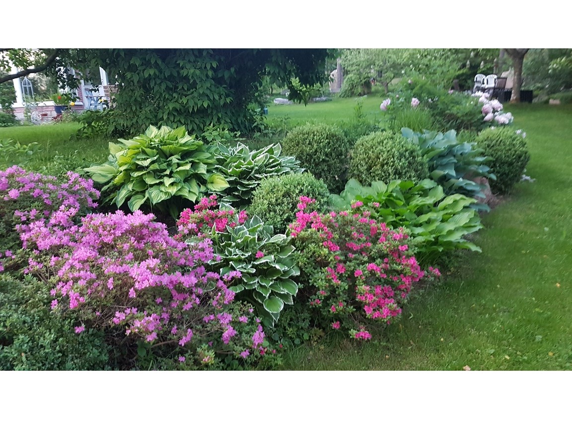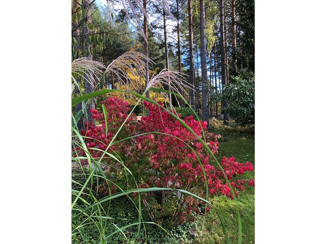 Rofylld ca. 3000 m2 anlagd trädgård med stora & små rum avdelade med buskar och häckar.