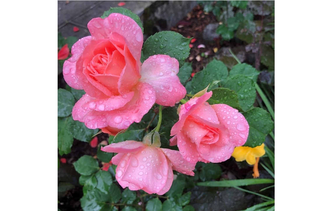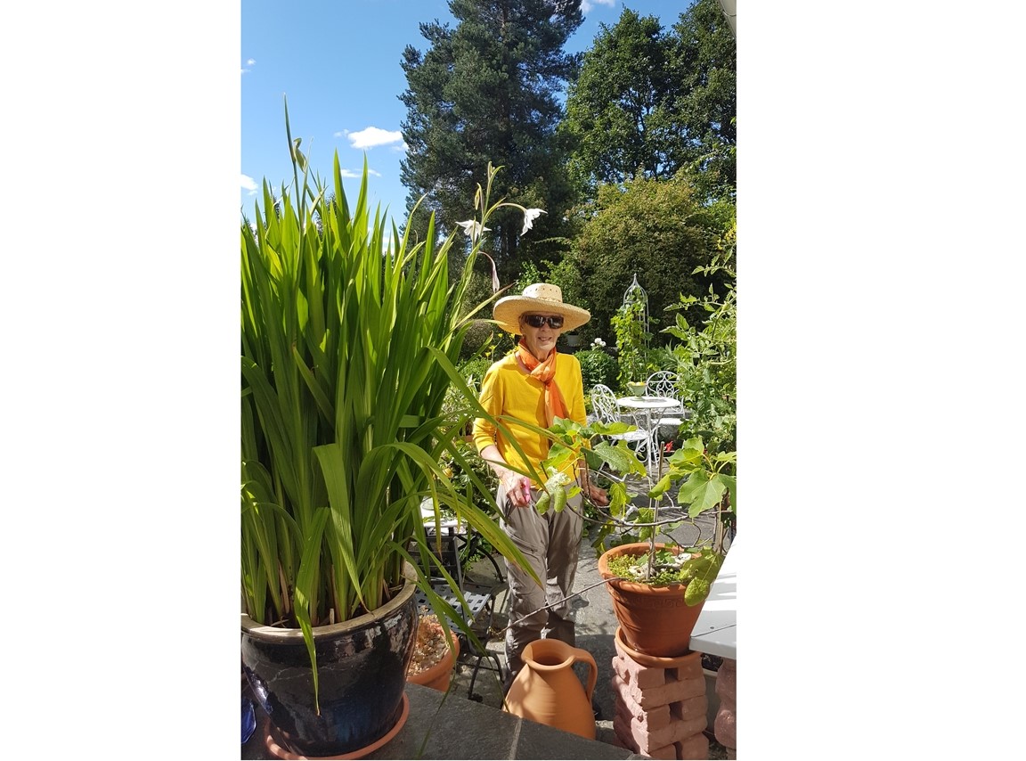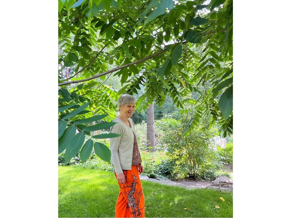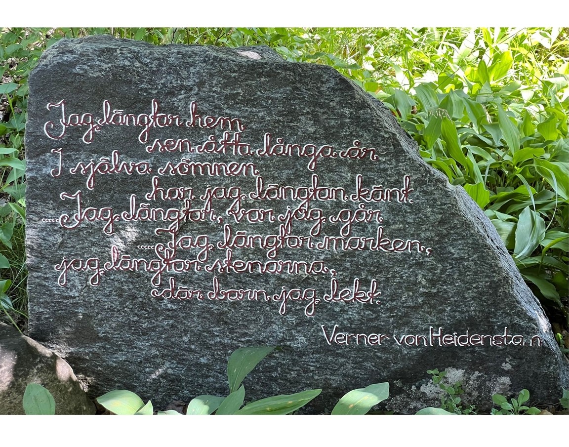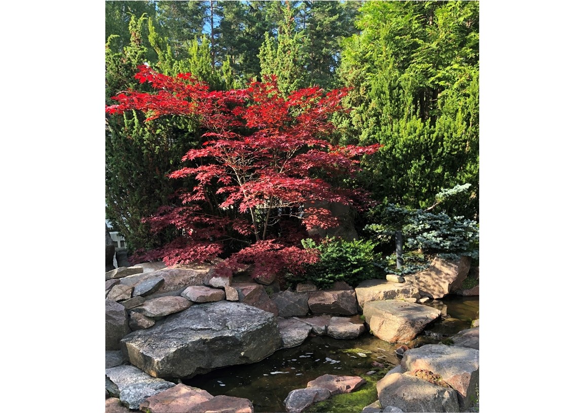 Stenar, vatten, rosor, buskar, blommor & träd är arrangerade i samklang med skogstomt sluttande mot sydväst.