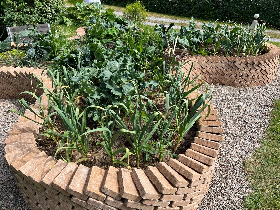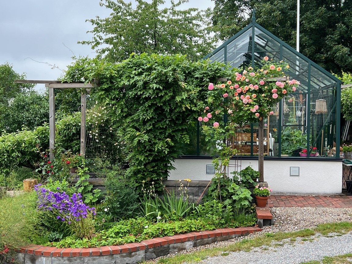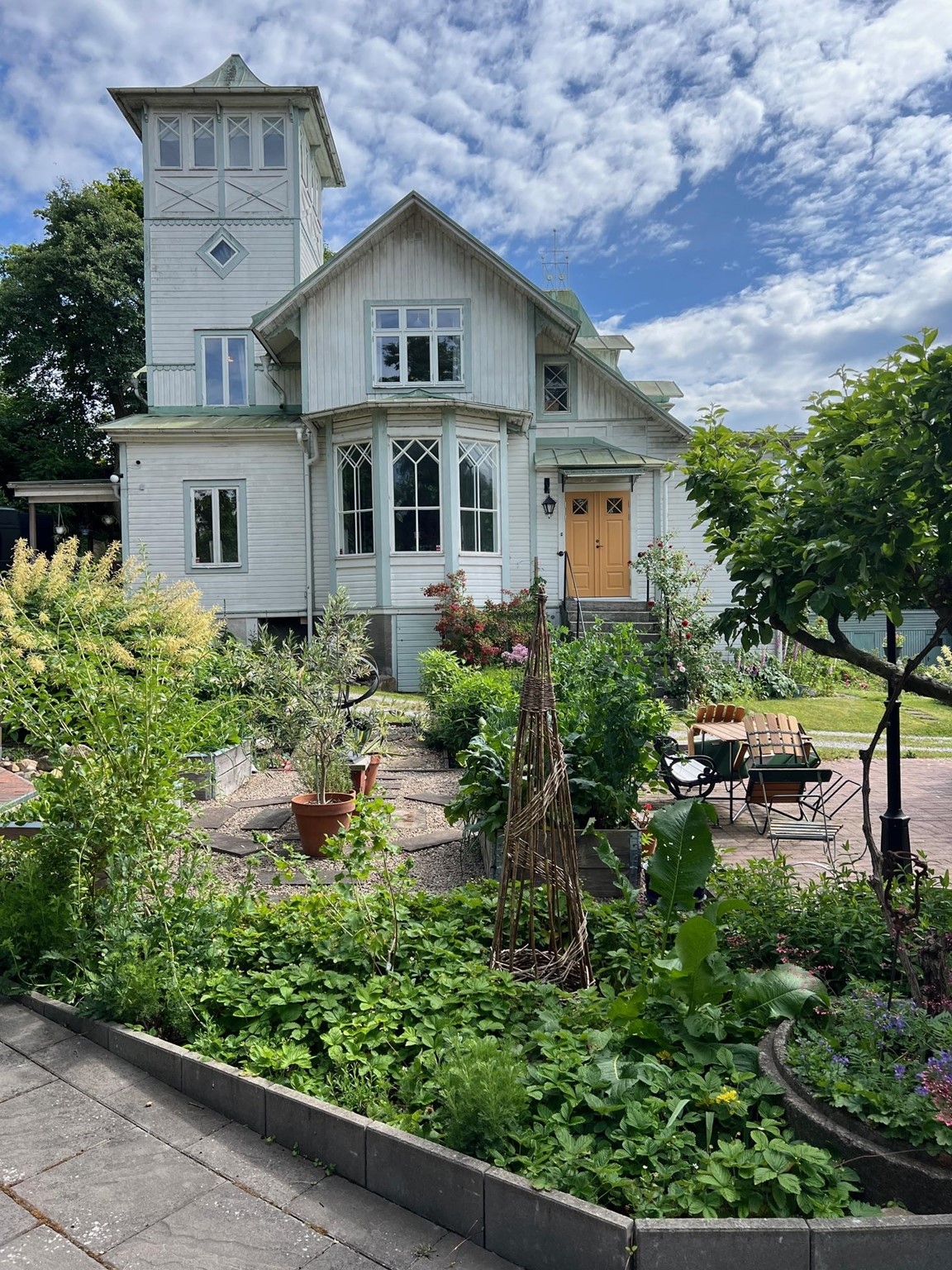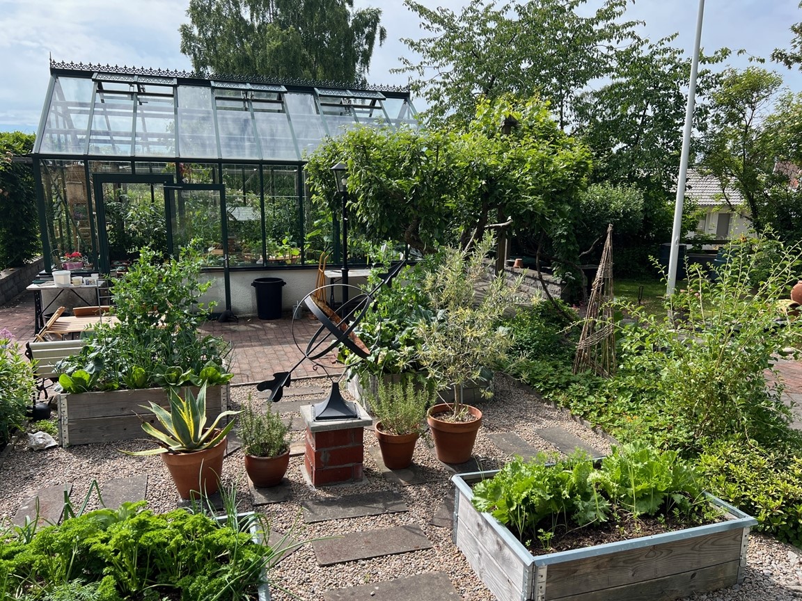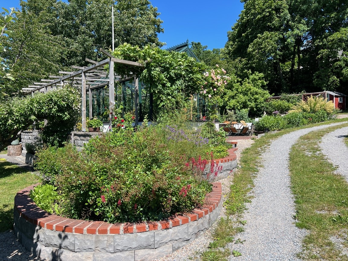 Trädgården hör till en sommarvilla från 1800-talets slut. Många växter har vi fått eller "ärvt". Vi har därför en viss förkärlek för perenner och gamla växter med historia. Odlingarna har dock till största delen kommit till de senaste 35 åren, men hämtar inspiration från äldre tid. I trädgården och tillhörande växthus odlar vi, förutom bärbuskar och fruktträd, en mängd olika grönsaker och blommor. Vi är särskilt stolta över kålgården, där olika kålsorter trivs tillsammans med blommor och kryddväxter som håller skadeinsekterna borta. Samodling av prydnads- och nyttoväxter är ett genomgående tema i alla våra odlingar. Vi använder även täckodling för att spara vatten och mata maskarna. Dessutom experimenterar vi glatt med nya (för oss) påfund som keyhole-garden och Hügelbädd. Nio komposter förser oss med jord och gödning så att vi nästan har en permakultur.