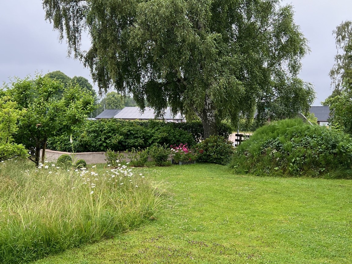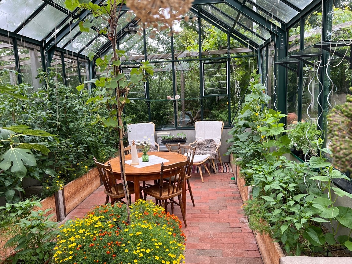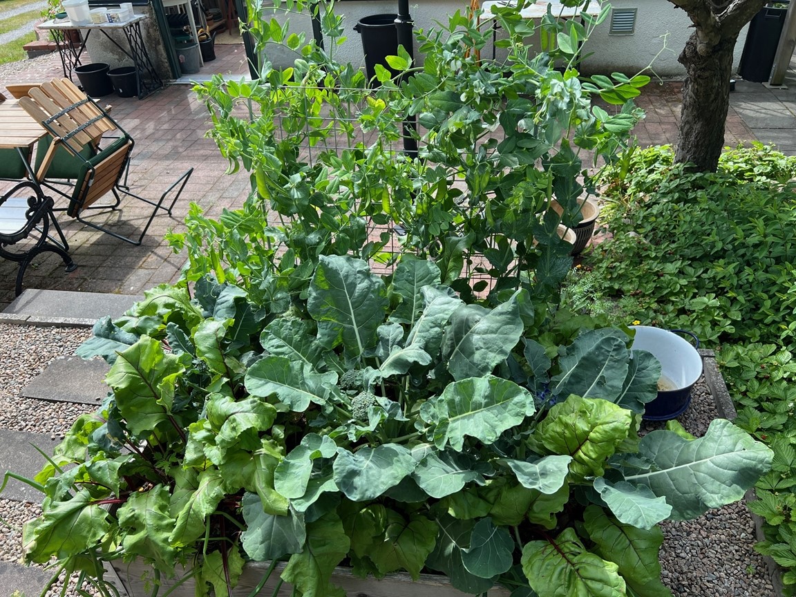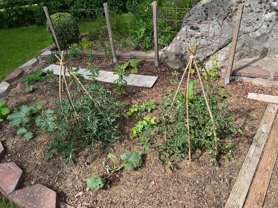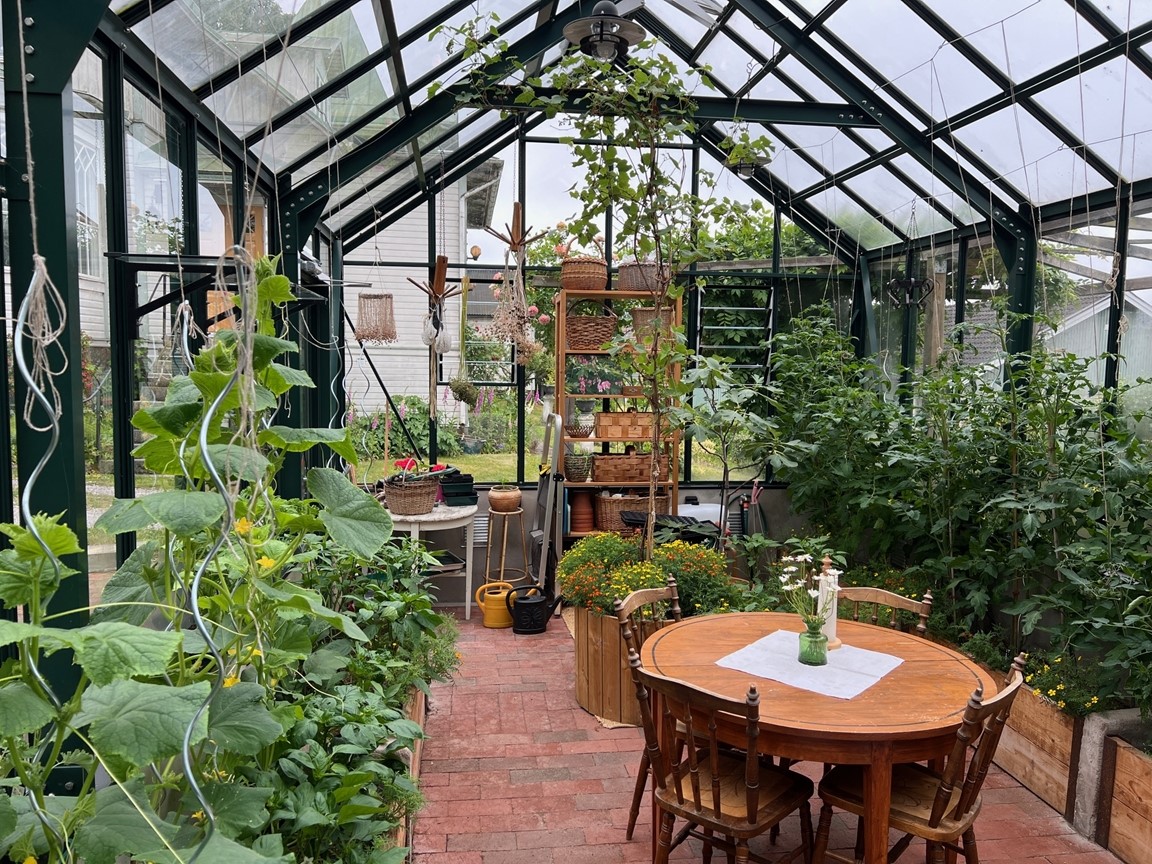 Trädgården hör till en sommarvilla från 1800-talets slut. Många växter har vi fått eller "ärvt". Vi har därför en viss förkärlek för perenner och gamla växter med historia. Odlingarna har dock till största delen kommit till de senaste 35 åren, men hämtar inspiration från äldre tid. I trädgården och tillhörande växthus odlar vi, förutom bärbuskar och fruktträd, en mängd olika grönsaker och blommor. Vi är särskilt stolta över kålgården, där olika kålsorter trivs tillsammans med blommor och kryddväxter som håller skadeinsekterna borta. Samodling av prydnads- och nyttoväxter är ett genomgående tema i alla våra odlingar. Vi använder även täckodling för att spara vatten och mata maskarna. Dessutom experimenterar vi glatt med nya (för oss) påfund som keyhole-garden och Hügelbädd. Nio komposter förser oss med jord och gödning så att vi nästan har en permakultur.