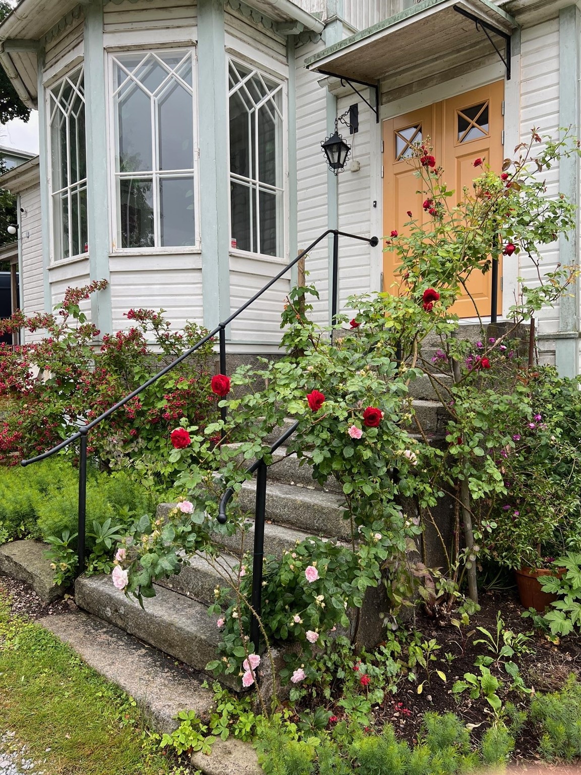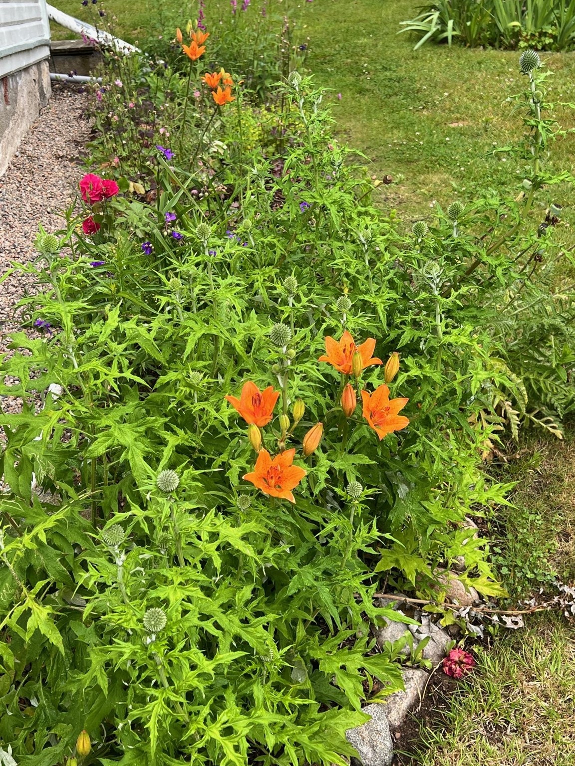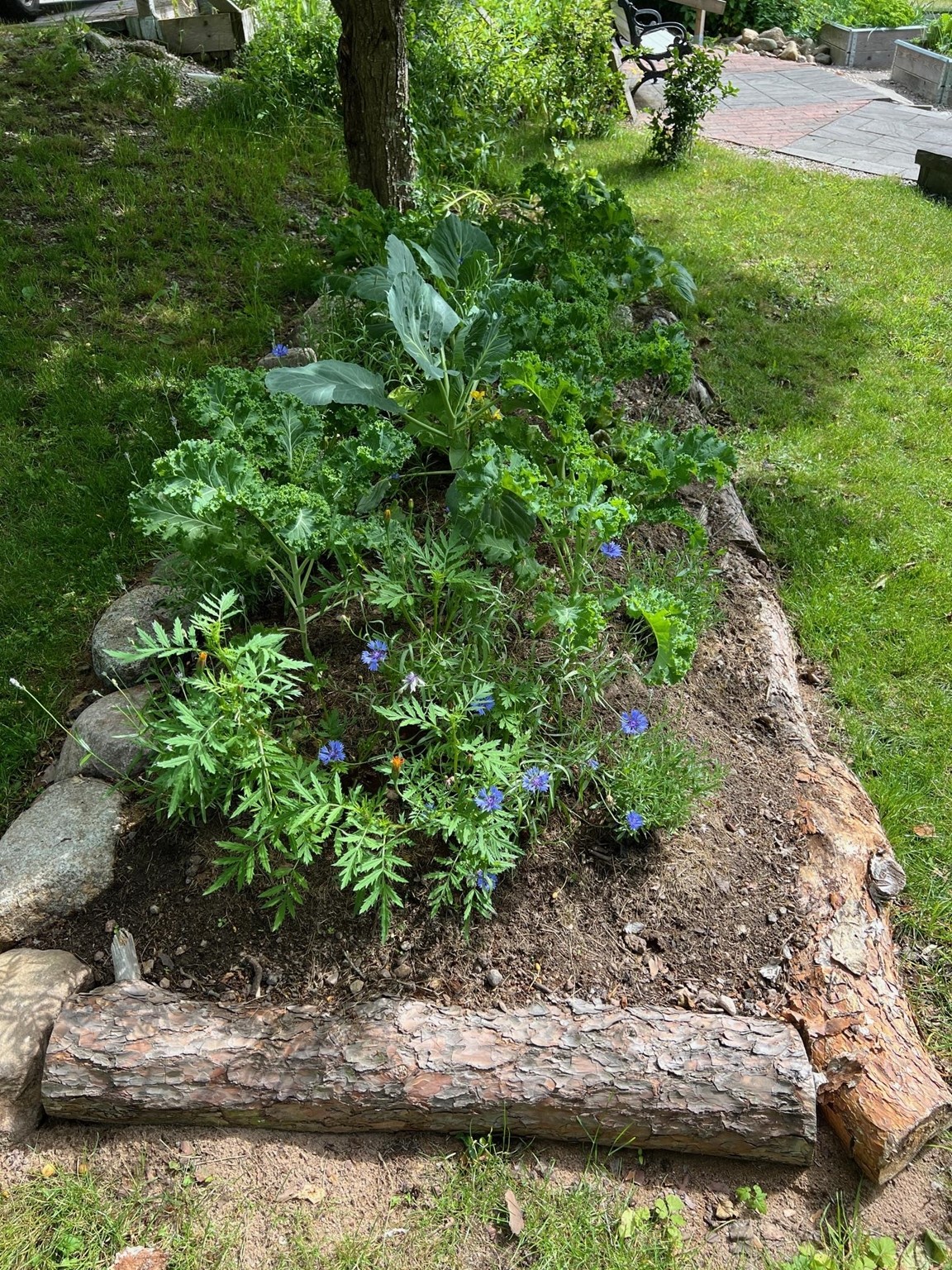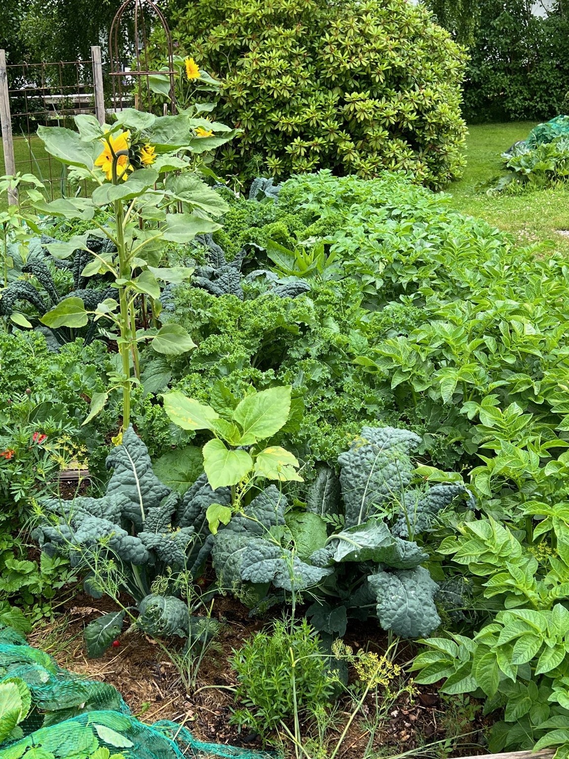Trädgården hör till en sommarvilla från 1800-talets slut. Många växter har vi fått eller "ärvt". Vi har därför en viss förkärlek för perenner och gamla växter med historia. Odlingarna har dock till största delen kommit till de senaste 35 åren, men hämtar inspiration från äldre tid. I trädgården och tillhörande växthus odlar vi, förutom bärbuskar och fruktträd, en mängd olika grönsaker och blommor. Vi är särskilt stolta över kålgården, där olika kålsorter trivs tillsammans med blommor och kryddväxter som håller skadeinsekterna borta. Samodling av prydnads- och nyttoväxter är ett genomgående tema i alla våra odlingar. Vi använder även täckodling för att spara vatten och mata maskarna. Dessutom experimenterar vi glatt med nya (för oss) påfund som keyhole-garden och Hügelbädd. Nio komposter förser oss med jord och gödning så att vi nästan har en permakultur.