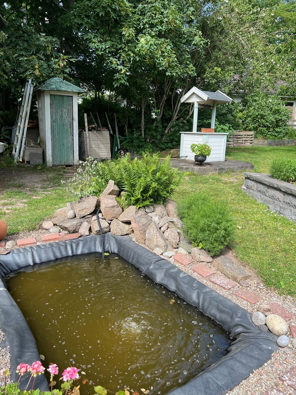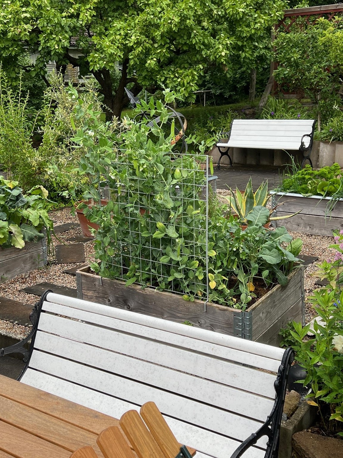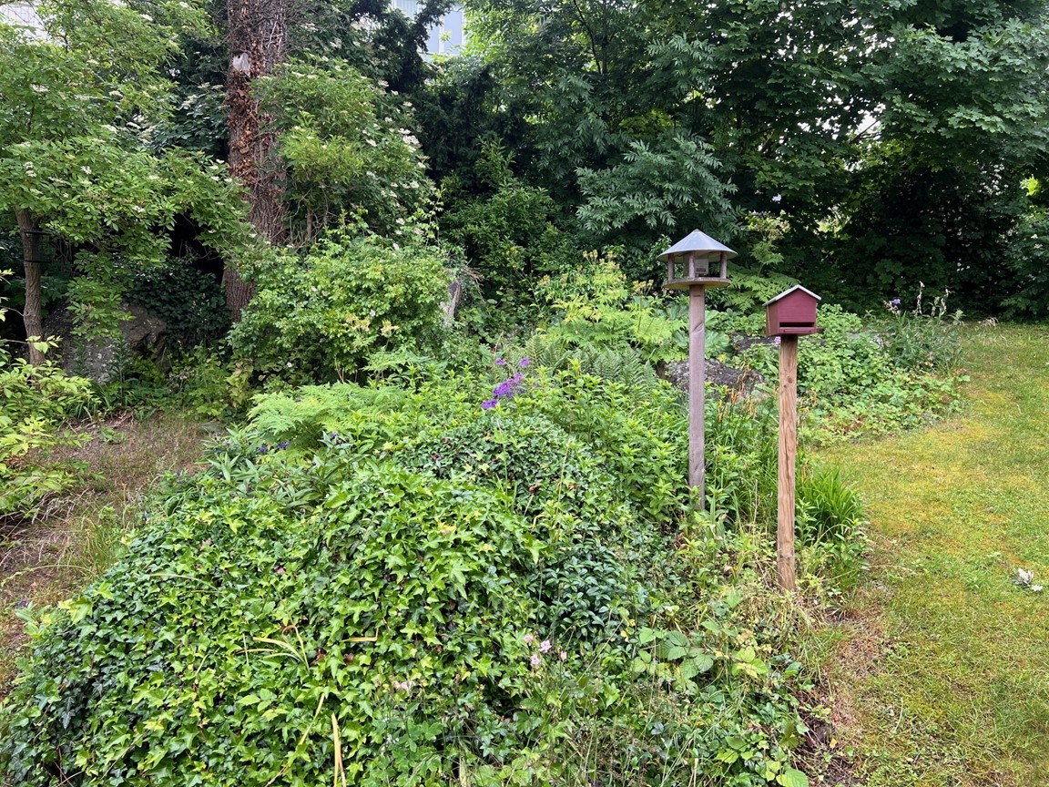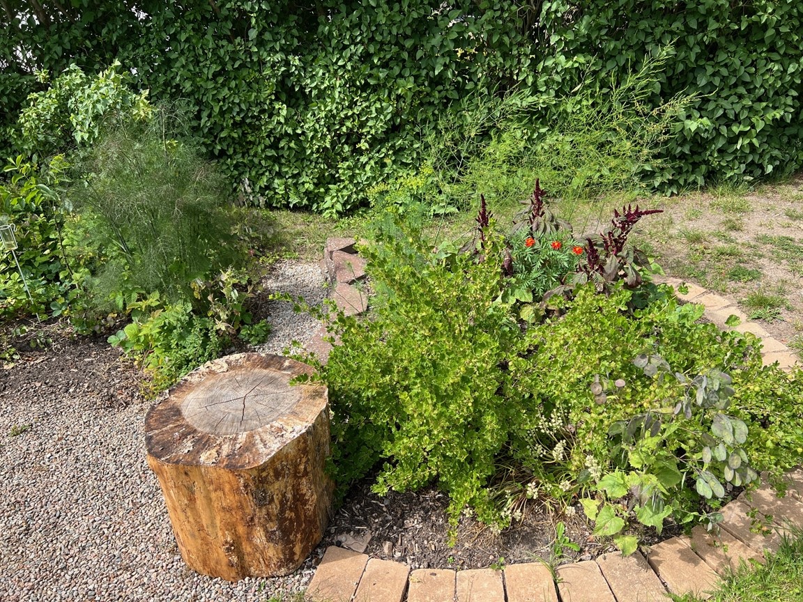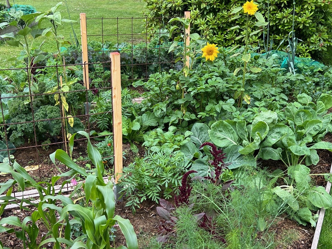 Trädgården hör till en sommarvilla från 1800-talets slut. Många växter har vi fått eller "ärvt". Vi har därför en viss förkärlek för perenner och gamla växter med historia. Odlingarna har dock till största delen kommit till de senaste 35 åren, men hämtar inspiration från äldre tid. I trädgården och tillhörande växthus odlar vi, förutom bärbuskar och fruktträd, en mängd olika grönsaker och blommor. Vi är särskilt stolta över kålgården, där olika kålsorter trivs tillsammans med blommor och kryddväxter som håller skadeinsekterna borta. Samodling av prydnads- och nyttoväxter är ett genomgående tema i alla våra odlingar. Vi använder även täckodling för att spara vatten och mata maskarna. Dessutom experimenterar vi glatt med nya (för oss) påfund som keyhole-garden och Hügelbädd. Nio komposter förser oss med jord och gödning så att vi nästan har en permakultur.