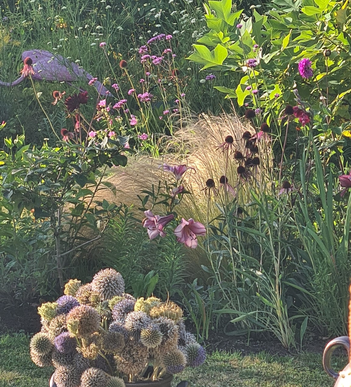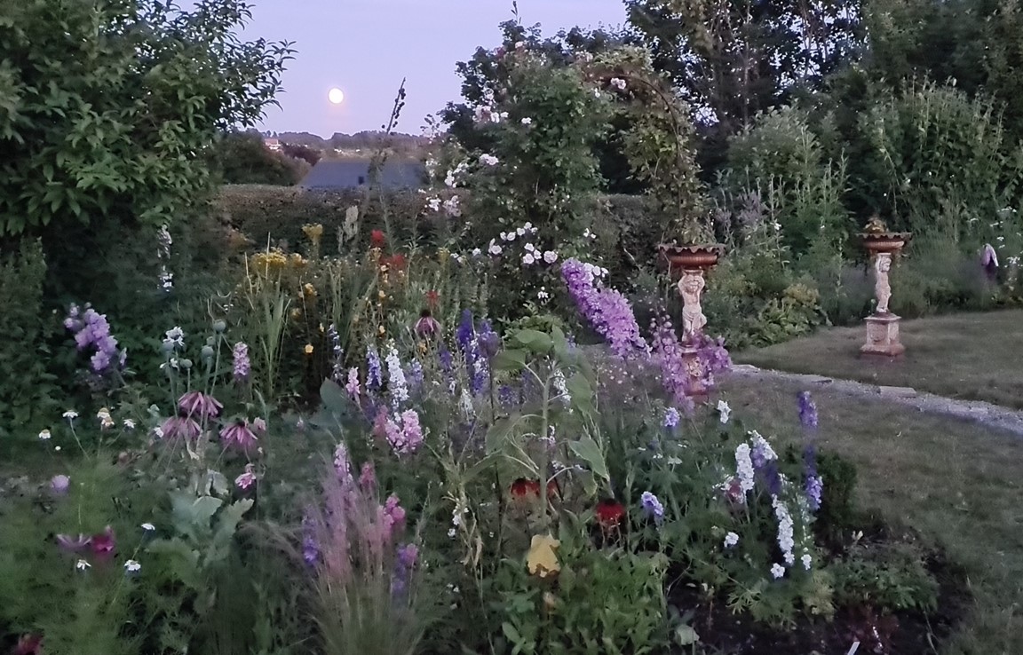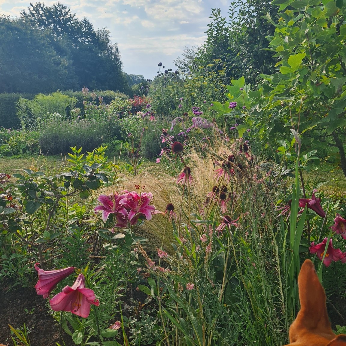 Vår trädgård är nästan 3000 kvm och består av etager. Ursprungligen ritad av trädgårdsarkitekt Tommy Nordström på 1990-talet, inspirerad av de italienska trädgårdarna. Trädgården är omringad av bokhäckar och strukturen i trädgården kretsar kring ett antal rundlar också de av bok. Vår trädgård ligger på Lilla Viks golfbana men också mittemellan de typiska äppelodlingarna på Österlen. Större delen av trädgården är på ren sandjord och vi har försökt att anpassa planteringarna efter det. Den övre delen av trädgården innehåller blomsterlök och perennplanteringar med rosor, pioner och magnolior. Den nedre delen låter vi vara delvis vild. I delar av trädgården odlar jag italienska ranunkler och anemoner och beroende på väder kan det, den 28 juni finnas självplock av dem. Delvis bor vi i Italien, så trädgården är i dag anpassad så att det går att lämna en månad då och då. Jag älskar att se de första ”riktiga” blommorna slå ut på våren lika mycket som jag fascineras av att lyckas knäcka koderna för att lyckas med sommarblommande lökar. Detta präglar min trädgård i dag. Jag gillar både att samla egna frön och framförallt att ta sticklingar. Försäljning av växter.
