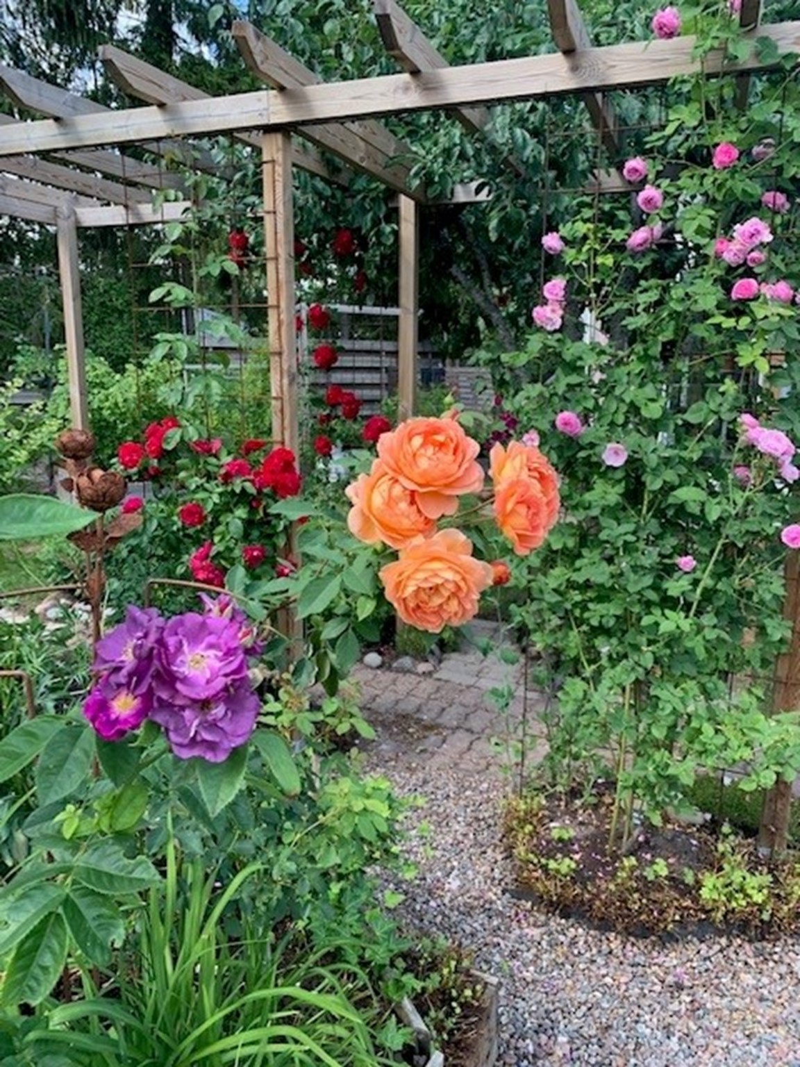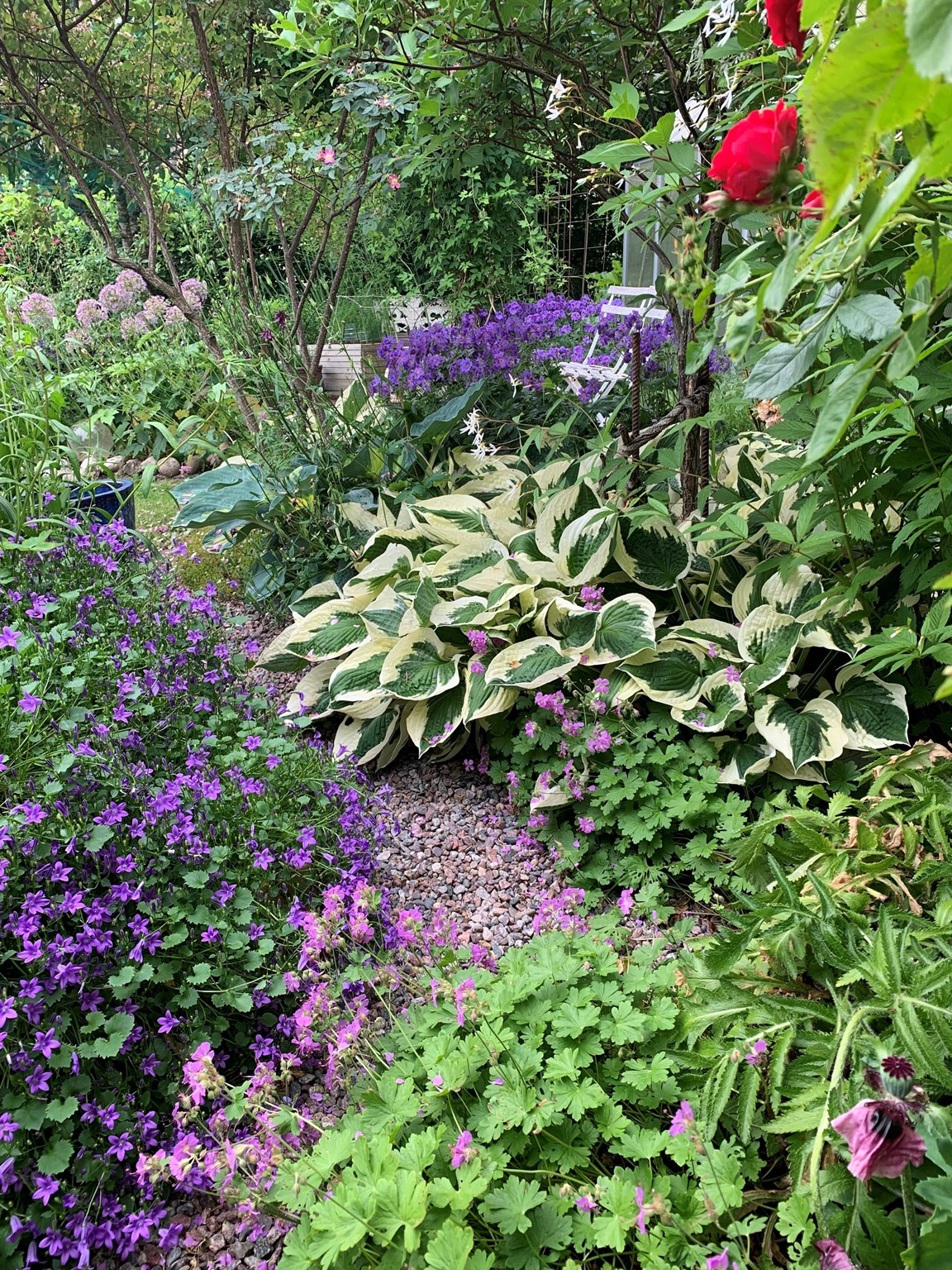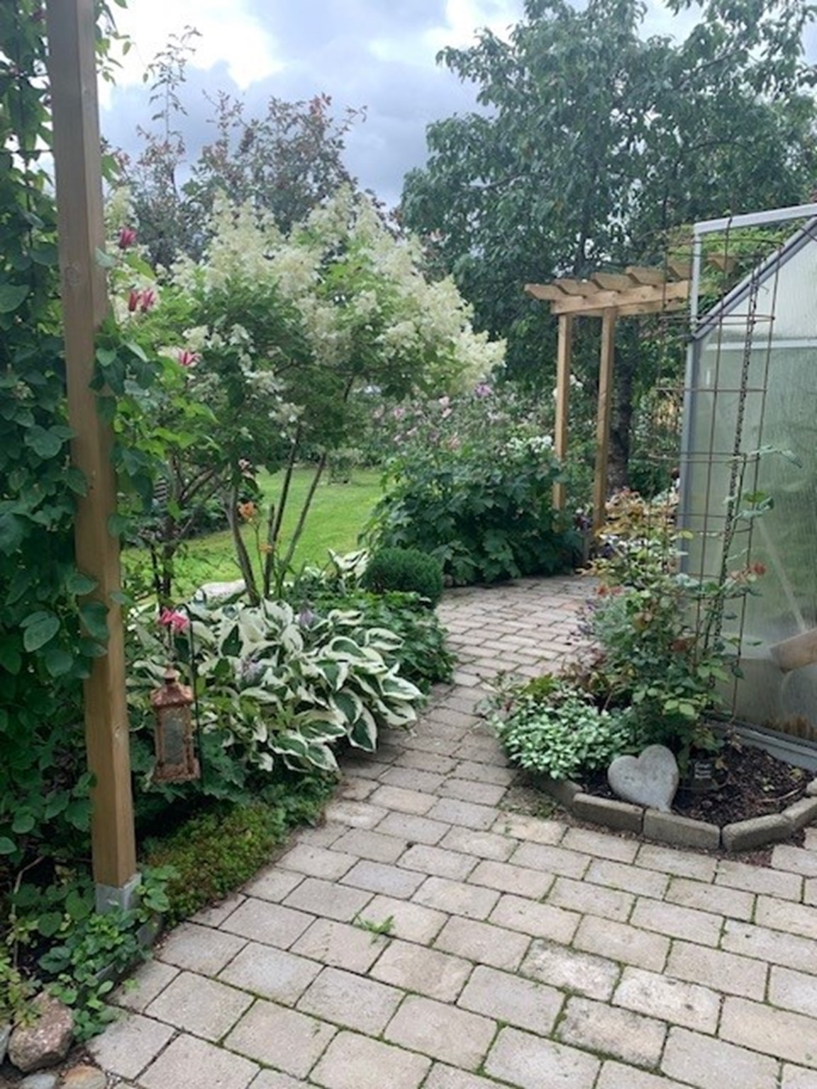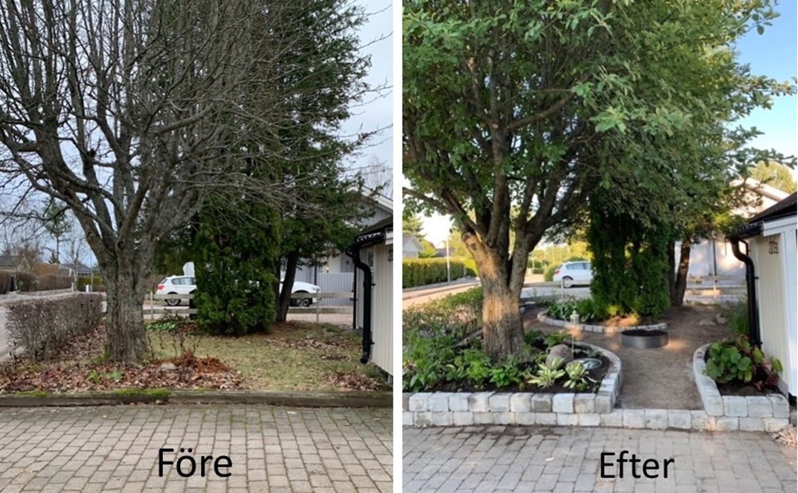 Trädgården finns i Sollentuna straxt norr om Stockholm och är ca 1000 kvm. När vi flyttade in i början på 2000 talet tog trädgårdsintresset fart och vi såg möjligheterna att skapa en trädgård där vi trivs. Vår trädgård har växt och växer fortfarande fram vartefter men det finns ingen plan direkt. Nya idéer dyker upp hela tiden och blir till projekt att ta sig an och Kent (maken) rycker in med gräv- och snickarhjälp. Det första vi gjorde var att bygga ett växthus och gräva en damm och numera sitter vi gärna vid dammen under säsongen och blir underhållna av Koi fiskar och Guldid. Vi tillbringar så gott som all fritid i trädgården och vi har tillsammans skapat rum i olika delar av trädgården med olika teman. Här finns ett litet Wood land och ett bär land. Grönsaker har sin plats och rosor tar mer och mer plats i trädgården. Vi har också skapat en Asien inspirerad del och det finns ett växthus där vi mest odlar tomater.