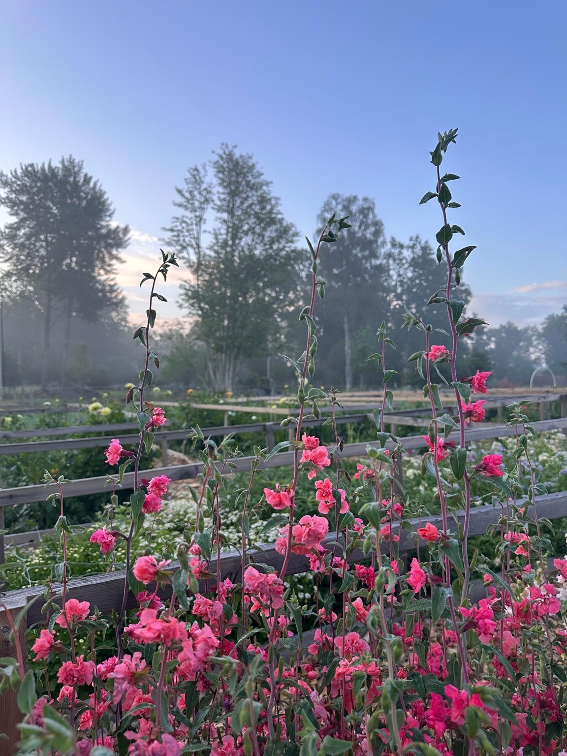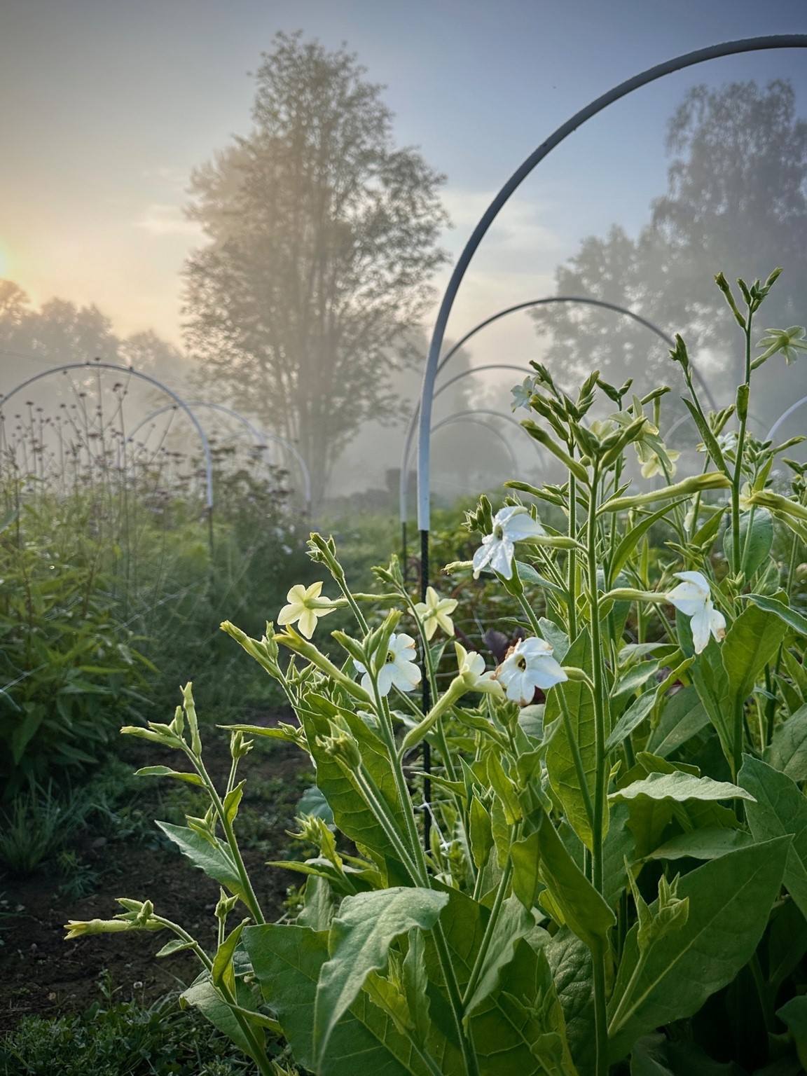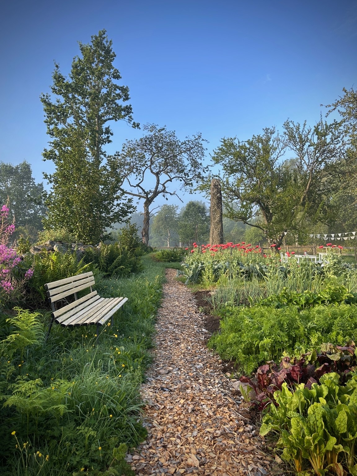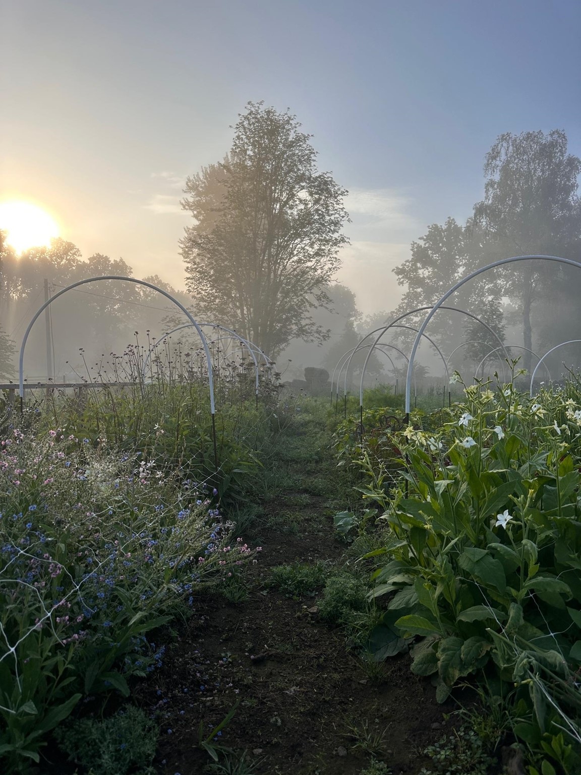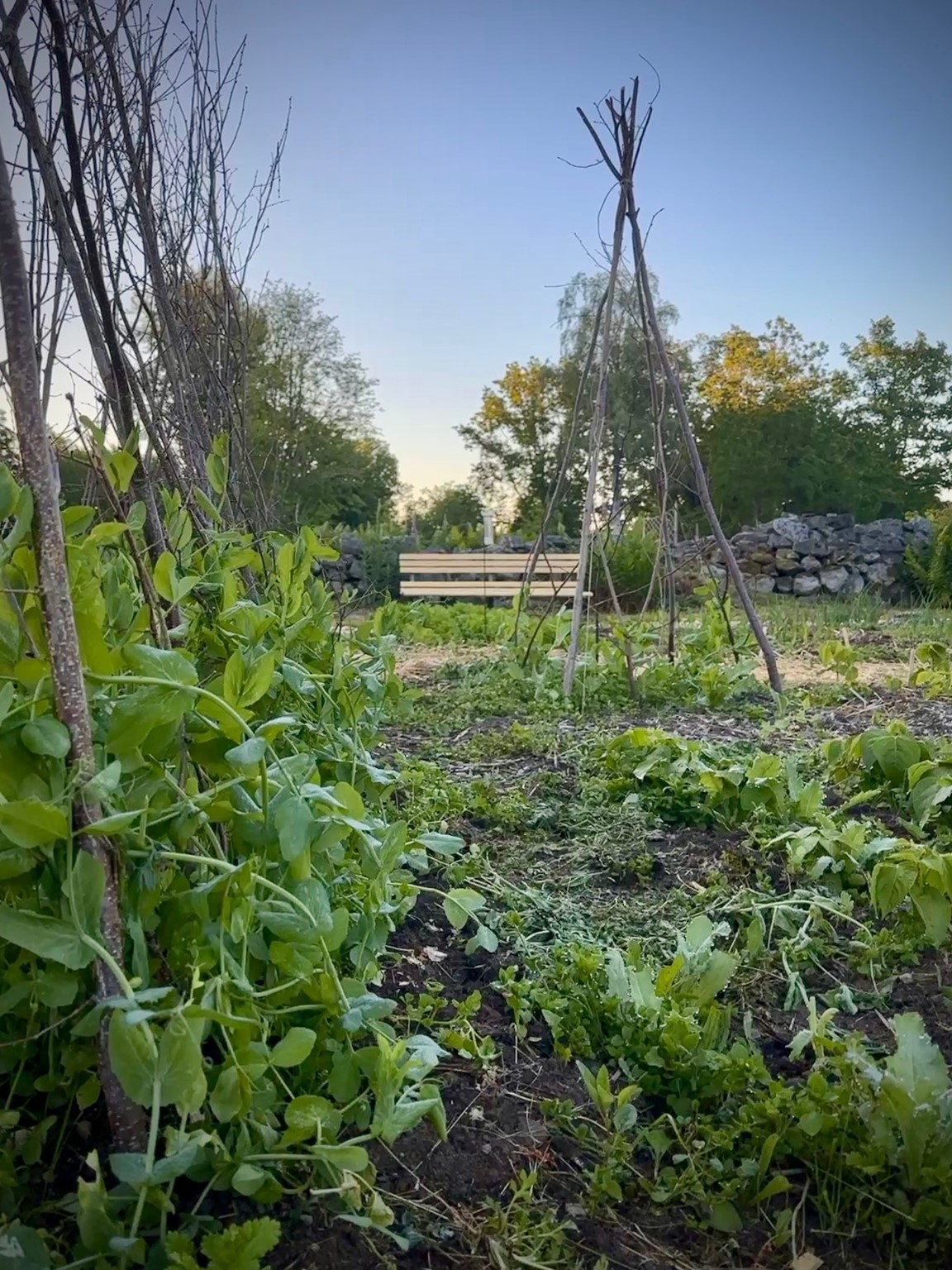I trädgården odlas grönsaker, kryddor och blommor i liten skala med inspiration från både äldre odlingstraditioner och moderna market gardening-metoder. I juni är odlingen i början av säsongen. Bäddarna är planterade och mycket är på väg upp ur jorden.