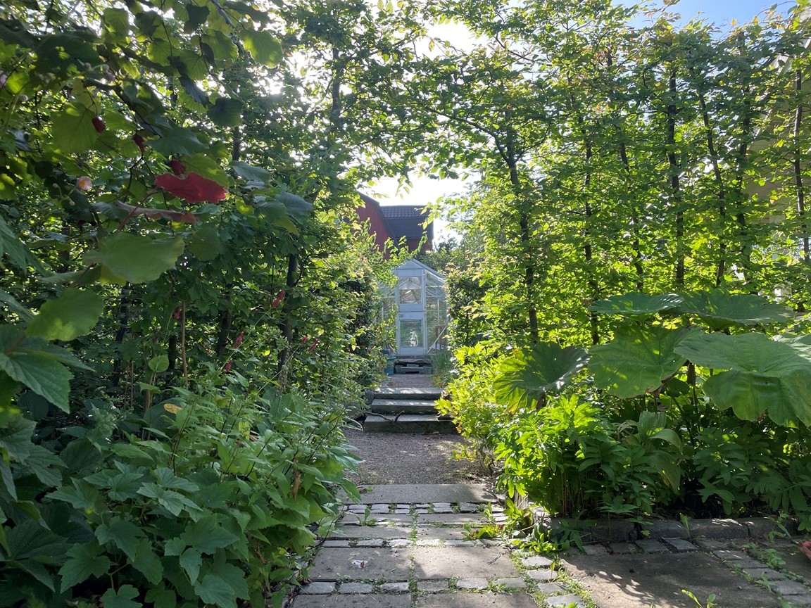 I ett villakvarter på Skoghall, dold bakom höga häckar, ligger en liten lummig trädgård. Slutenheten är i allra högsta grad medvetet anlagd för trädgården ska vara en egen värld – en oas, en tillflyktsort undan den hektiska vardagen.