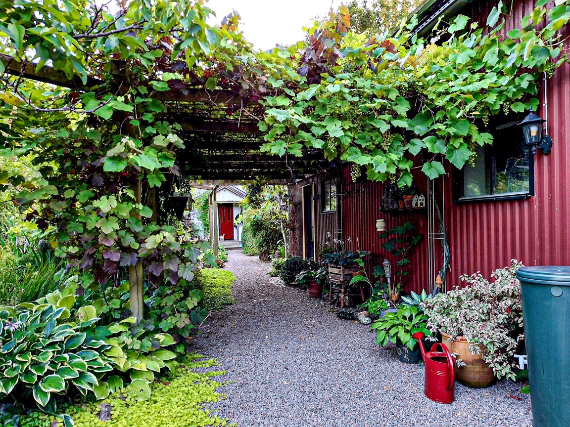 Välkommen till Anna och Rickard Carlssons stora trädgård med många buskar, träd och perenner. Här finns flera växthus för olika ändamål, ett stort trädgårdsland med odling av det mesta och en fruktträdgård intill.