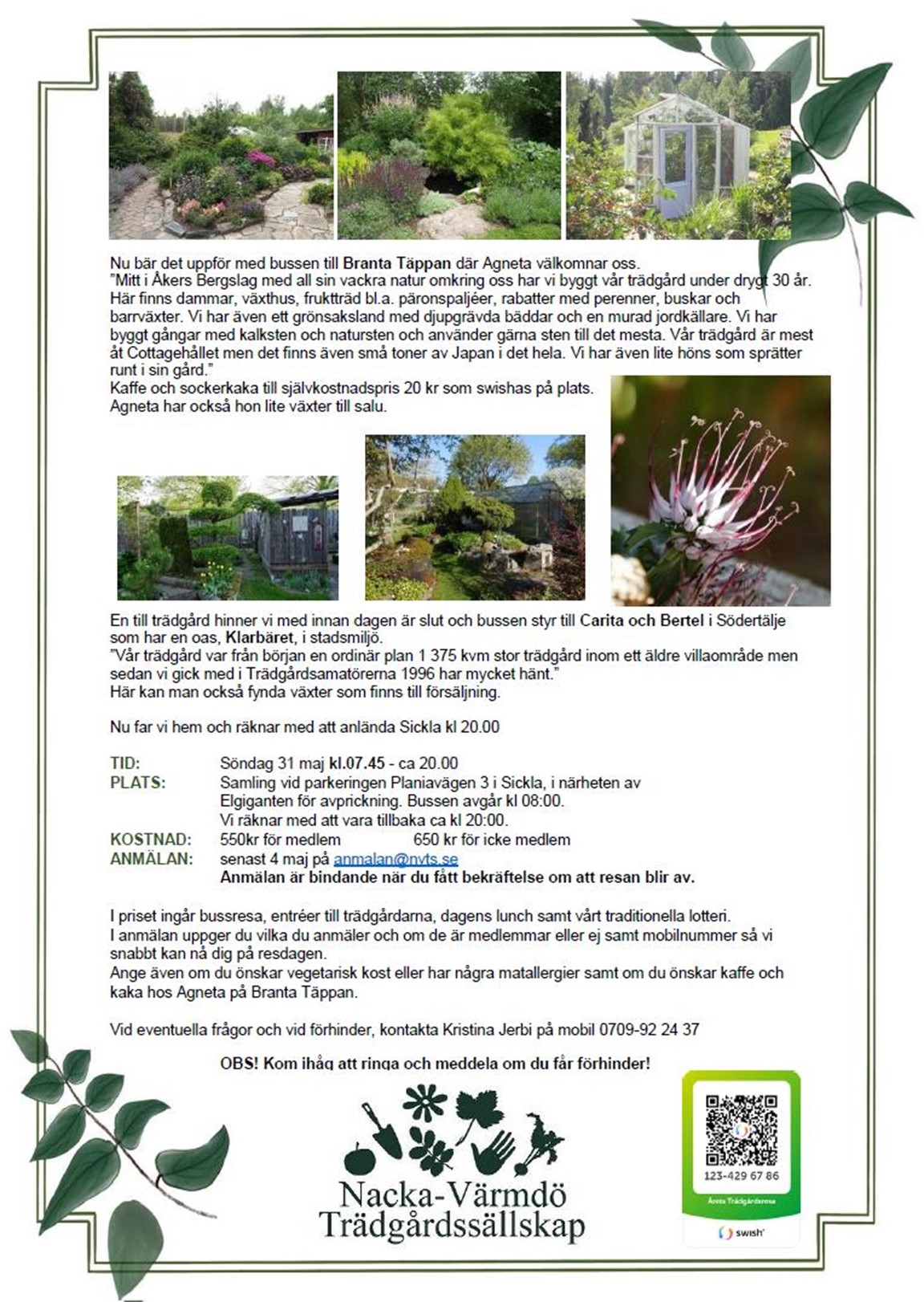 Anmälan är bindande när du fått bekräftelse om att resan blir av. I priset ingår bussresa, entréer till trädgårdarna, dagens lunch samt vårt traditionella lotteri. I anmälan uppger du vilka du anmäler och om de är medlemmar eller ej samt mobilnummer så vi snabbt kan nå dig på resdagen. Ange även om du önskar vegetarisk kost eller har några matallergier samt om du önskar kaffe och kaka hos Agneta på Branta Täppan.