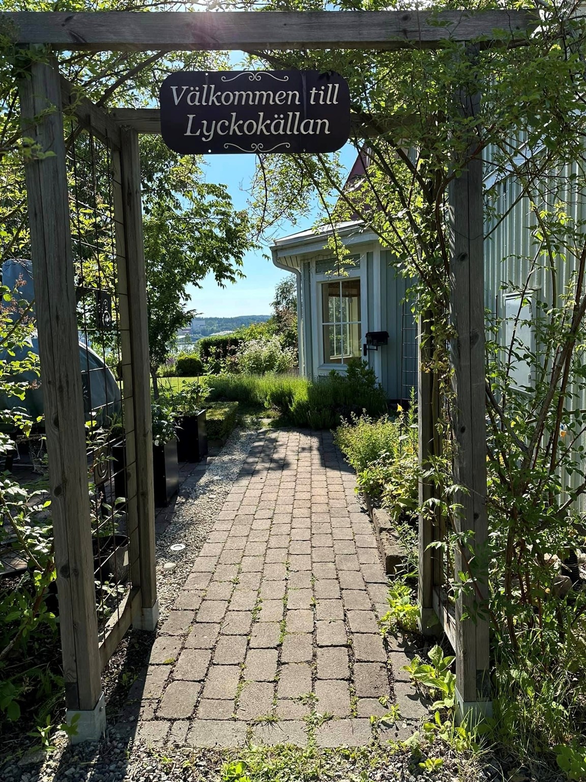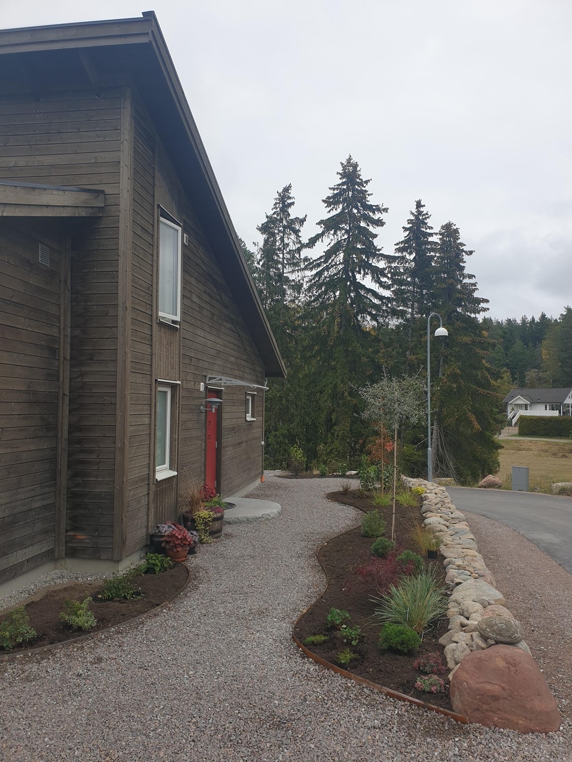 Min trädgård ligger precis till höger när du kommer gående uppför backen och vägen gör en mjuk sväng runt en kallmurad stenmur. Stenmuren ramar in vår framsida, entren till både hus och trädgård. Det