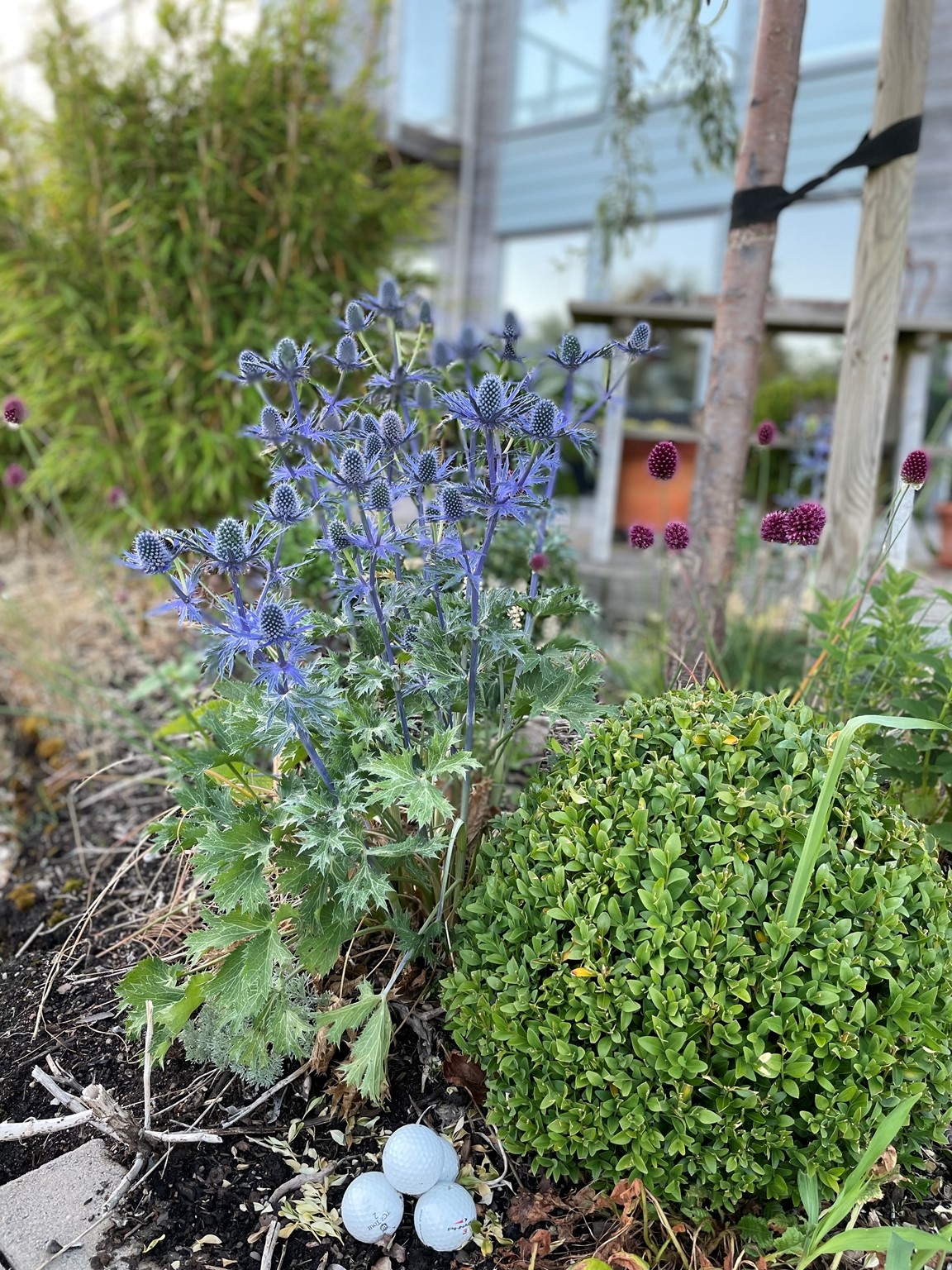 Hej! här finns olika perenner buskar o träd i mysiga trädgårdsgångar. 2000 kvadrat till ytan. En ganska stor damm med näckrosor och koifisk.
