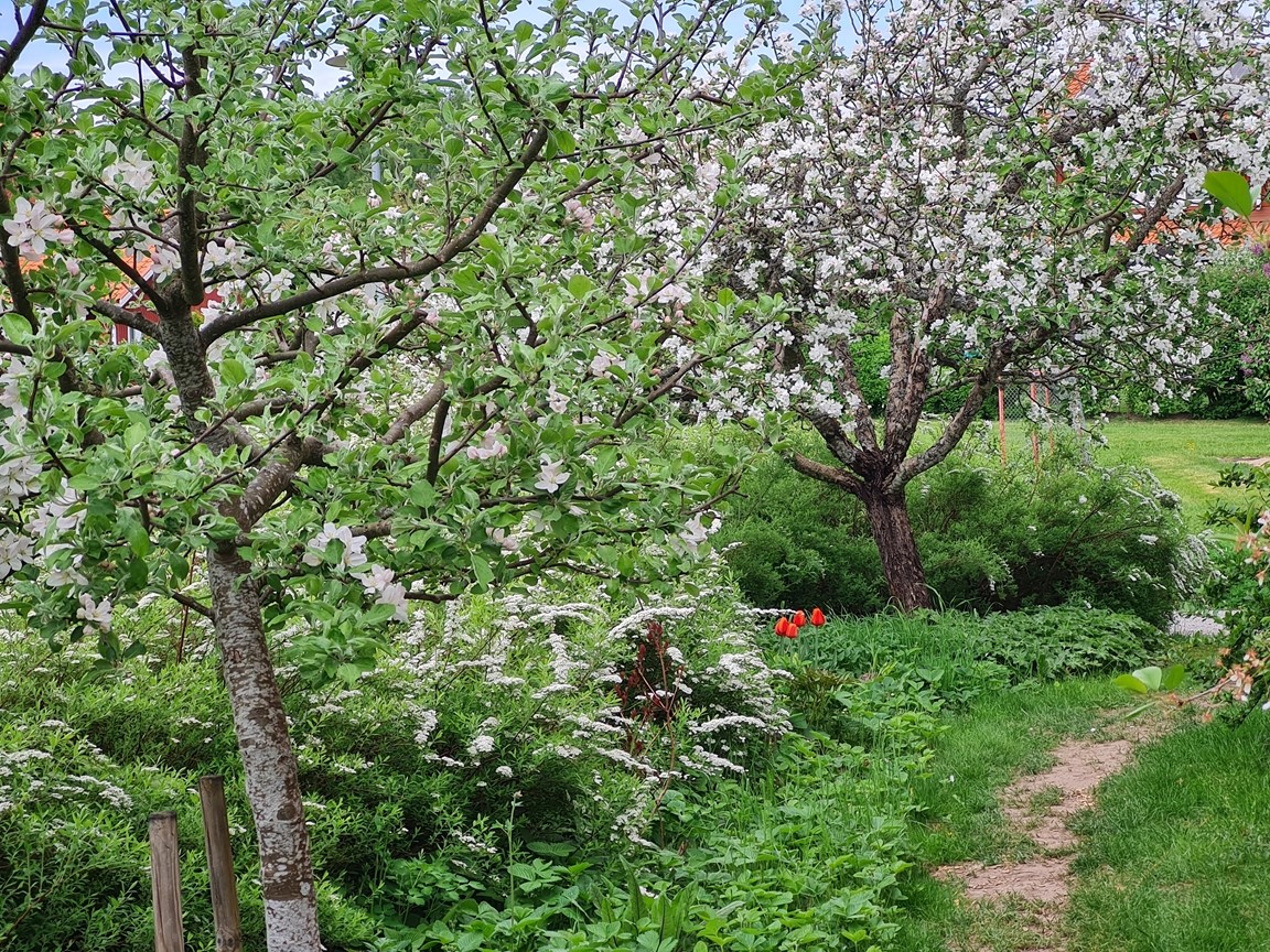 Vi är två landskapsarkitekter som sedan 2013 omvandlat vår ca 600 kvm privata trädgård vid vårt parhus från gräsmatta och rabatter till en lummig oas med