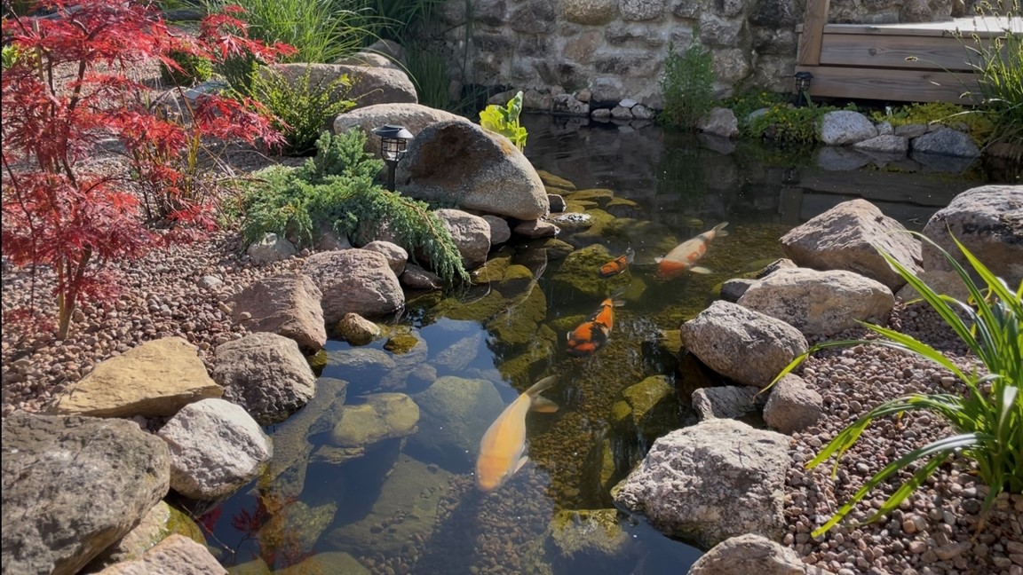Varmt välkomna! Hos oss är dammarna trädgårdens hjärta och starten på vår trädgårdsresa. Här finns en mindre damm på 10 kubik med guldfi