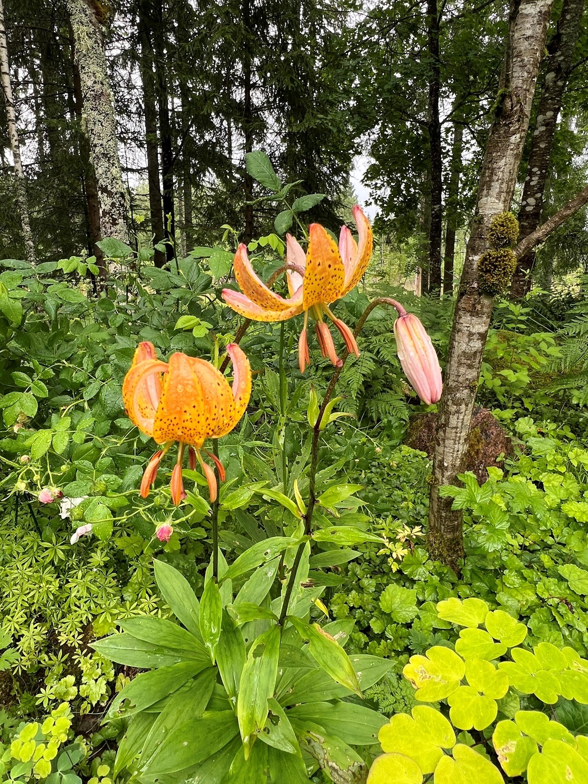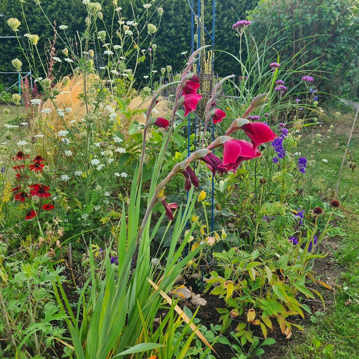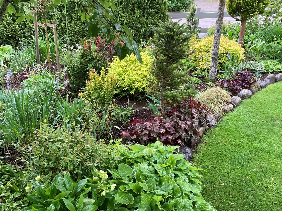 Vi har en trädgård i ständig förändring, något nytt läggs till varje år. Trädgården består av många rum skapade av ligusterhäcka
