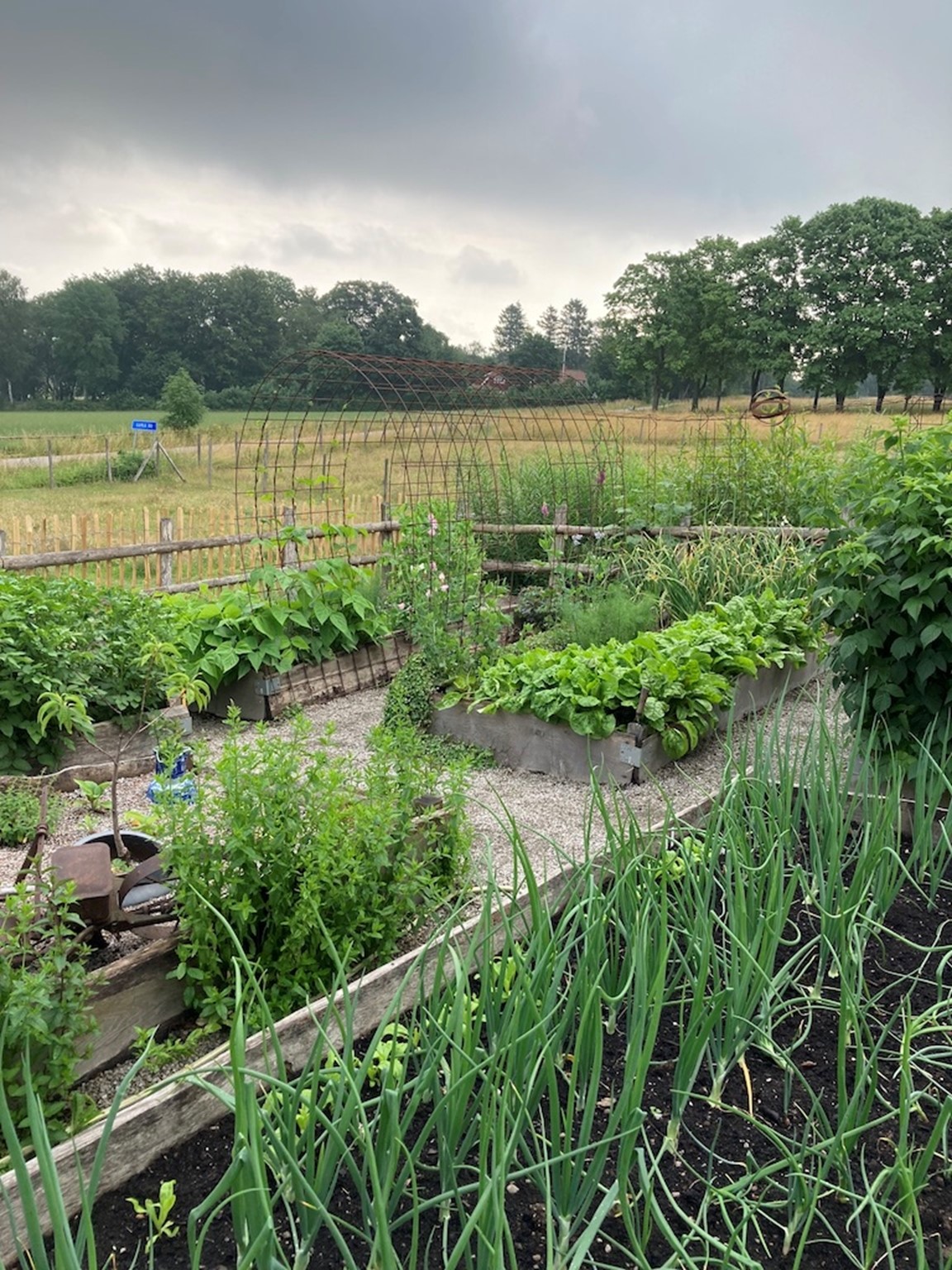 En mycket lummig trädgård som vuxit fram under 30 år. Här finns gamla fruktträd, perennarabatter och många rosor som väller över slanstaketet med klematis som klättrar högt . I egenbyggda v