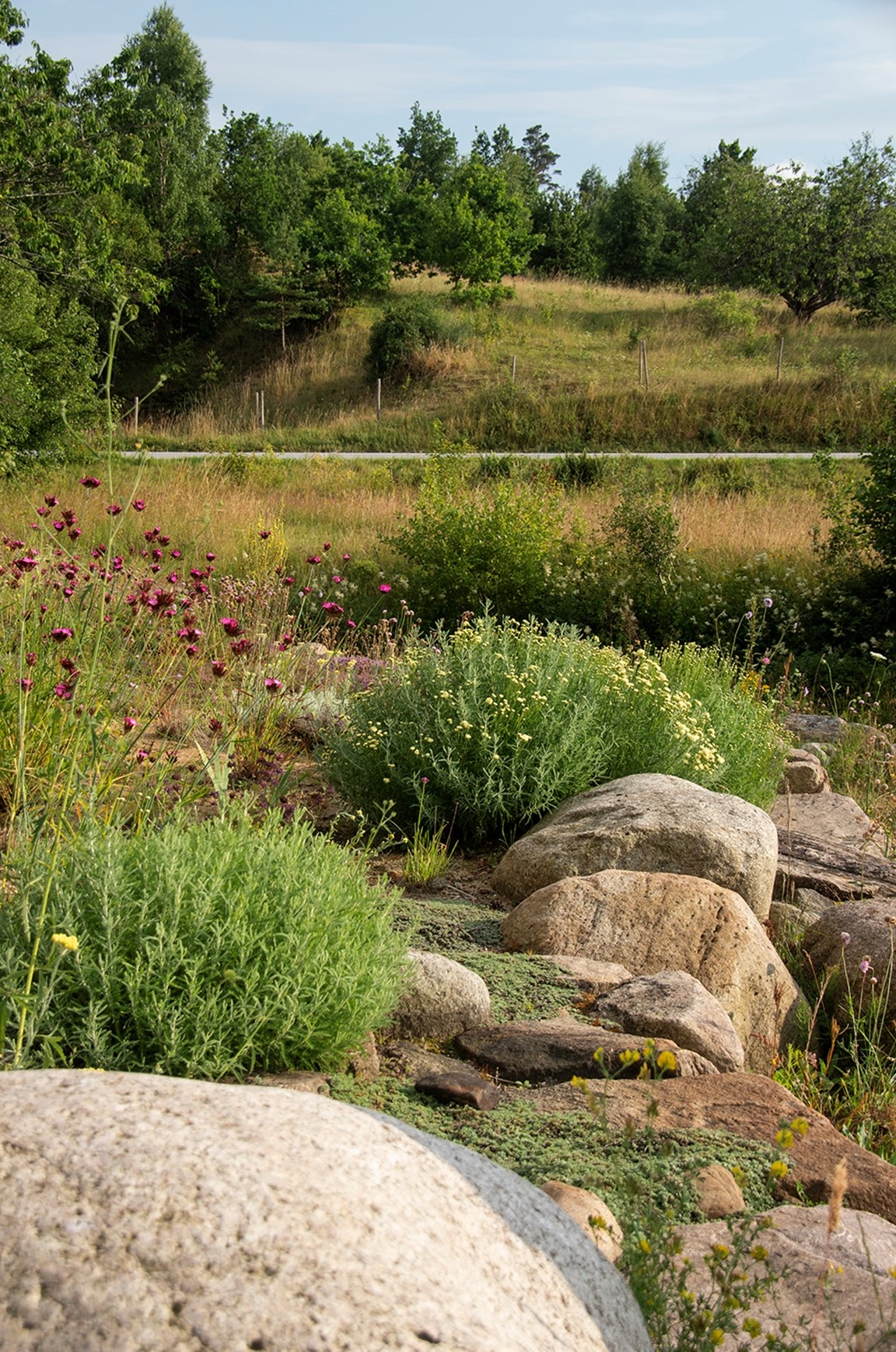 Trädgården ligger i ett landskap med sandbackar och naturreservat som granne. Här finns rabatter med torktåliga perenner, trädgårdsängar, grusträdgård