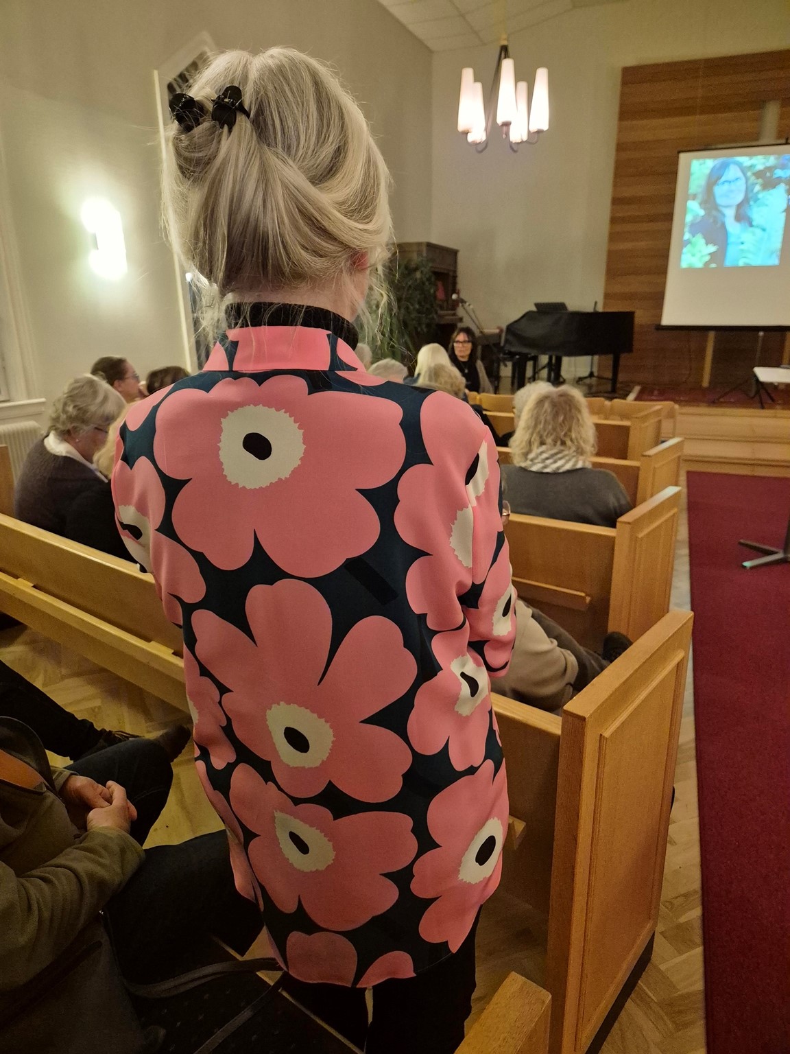 Vårens första aktivitet stod Kerstin Bohlin för. Hon driver Klockaregårdens trädgårdsbutik i Ör. Hon pratade och visade bilder på favoritväxter, före och efterbilder på projekt butiken haft i trädgårdar. Det var väldigt underhållande. En besökare hade på sig en så fin blus från Marimekko så den är jag ju tvungen att visa!!!