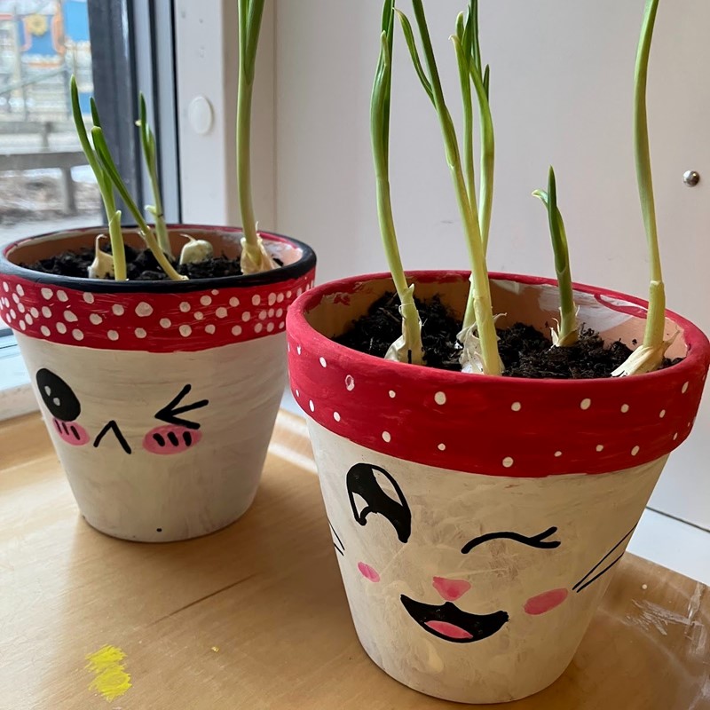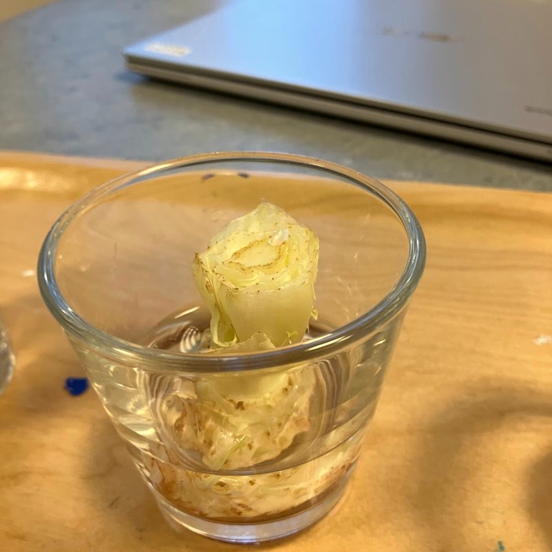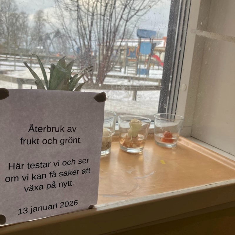 Flera av våra grönsaker som vi köper kan vi återbruka på olika sätt. Det kan handla om roten till purjolöken, romansalladen eller salladslöken. Vitlöksklyftor som börjat bli lite gamla och skjuter skott ska du inte kasta, utan använd dem igen. Blasten är mild och god. Även toppen på moroten kan återodlas. Blasten som växer upp från morots-toppen är perfekt att göra pesto av. Det här är ett bra sätt att lära barn hur man kan ta vara på sådant som normalt sett hamnar i komposten. Våra elever tyckte att det var otroligt spännande och märkligt att det kom upp nytt från roten av grönsakerna och toppen av moroten.