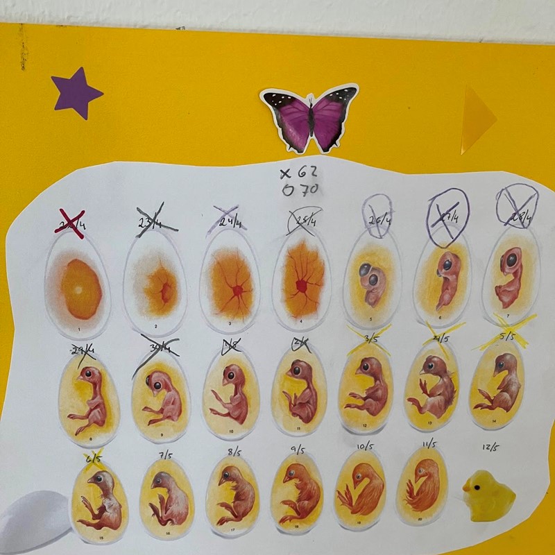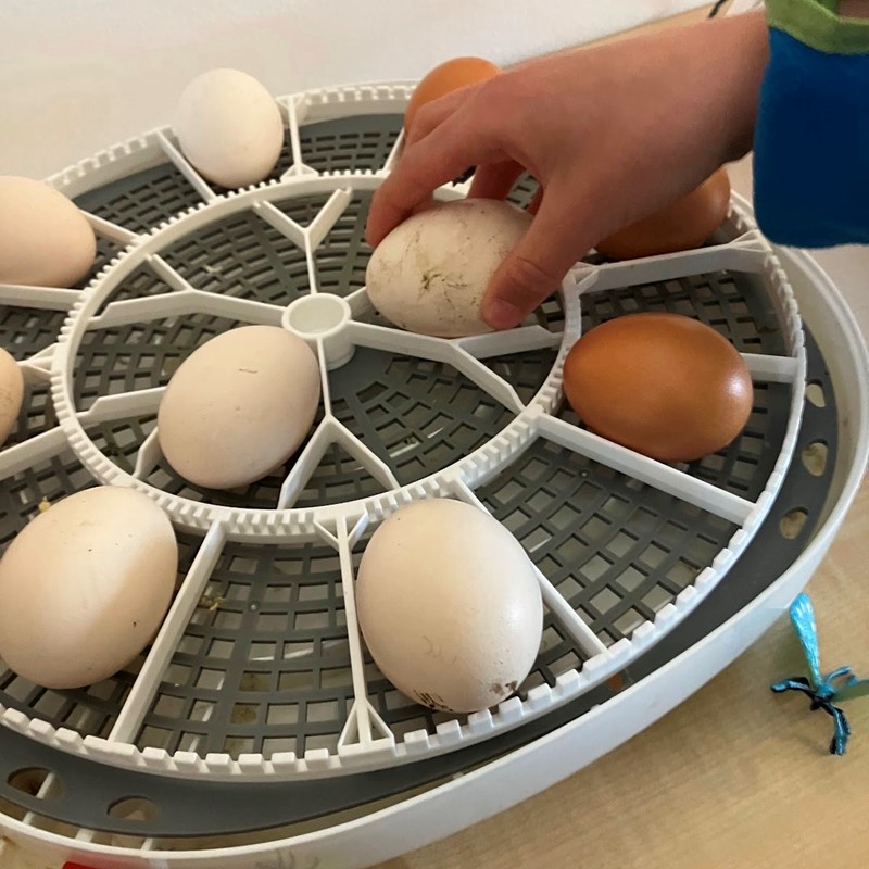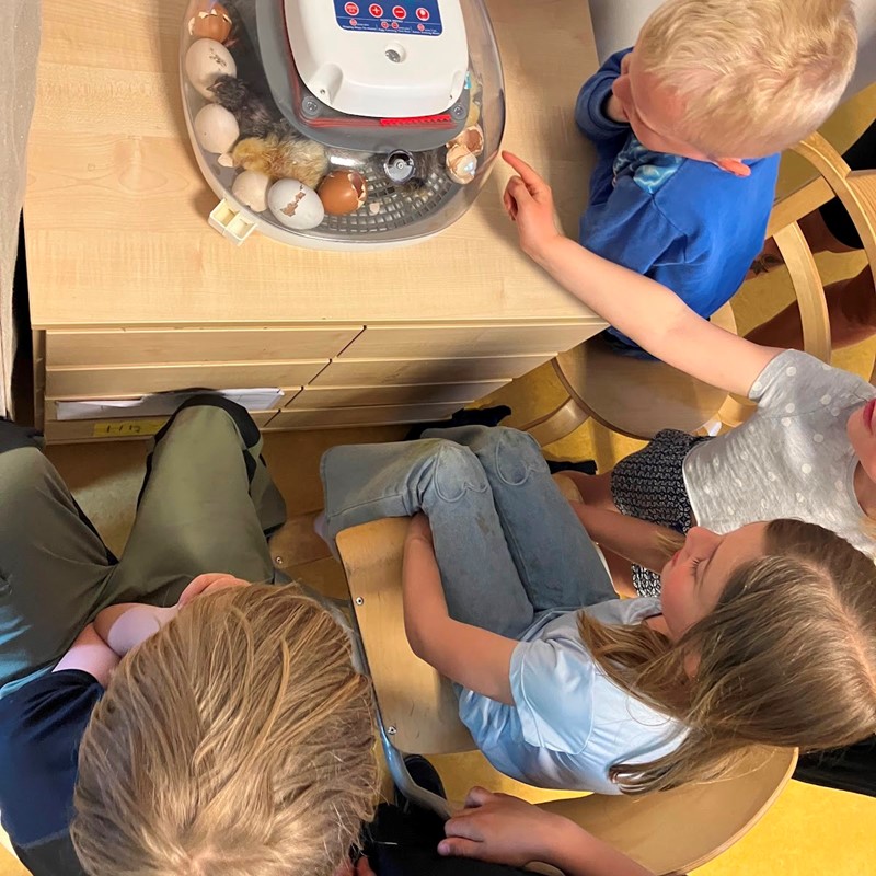 - Räkna ut vilket datum ni vill att kycklingarna ska kläckas och se till att ha ägg och maskin redo exakt 21 dagar innan. Om det är i skolmiljö, som vi har det, så är det bra att tänka på att de inte ska kläckas på en helg. Vi brukar tänka att kläckningen ska vara en tisdag eller onsdag då är det många barn som får följa själva äggkläckningen. Det är en av höjdpunkterna i den här processen och det brukar samlas både personal och barn runt maskinen under dessa dagar.