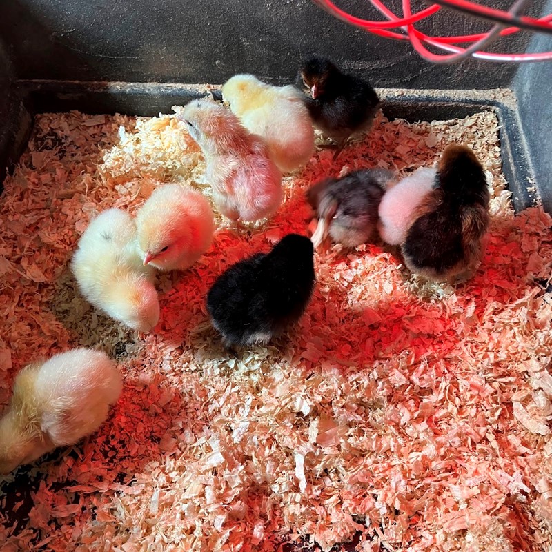 - Förbered buren eller lådan där kycklingarna ska bo sin första vecka. Vi brukar lägga ett tunt lager med sågspån och lite papper i botten. Om ni har en värmelampa så tänk på att den ska hänga ganska nära kycklingarna.