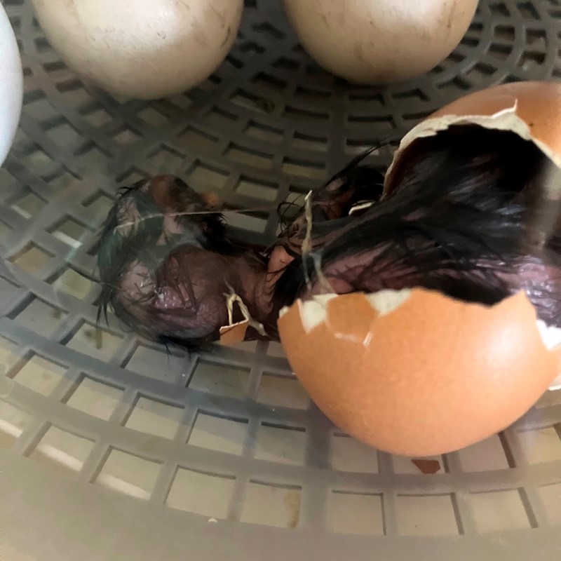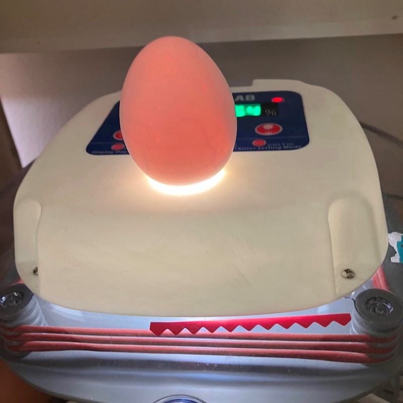 Här kan vi se om ägget är befruktat genom att använda den inbyggda lampan. Om det är ådror och lite svart inne i ägget så är det befruktat.