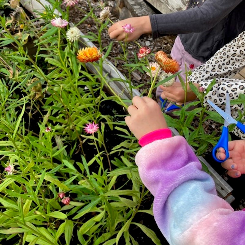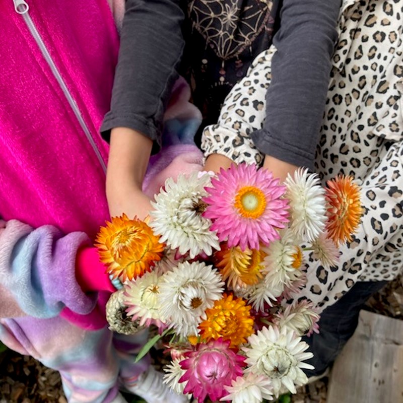 På vårt fritidshem sådde vi många olika snittblommor i våras. Den här gången valde vi att odla ganska mycket eterneller. Dessa blommor är lätta att torka och fantastiskt vackra och hållbara. Det som kan vara nackdelen med eterneller är att stjälken kan bli ganska skör och lätt går sönder när den torkat. Därför har vi gjort "fejk-stjälkar". Det är lite pilligt men eleverna tycker det är kul.