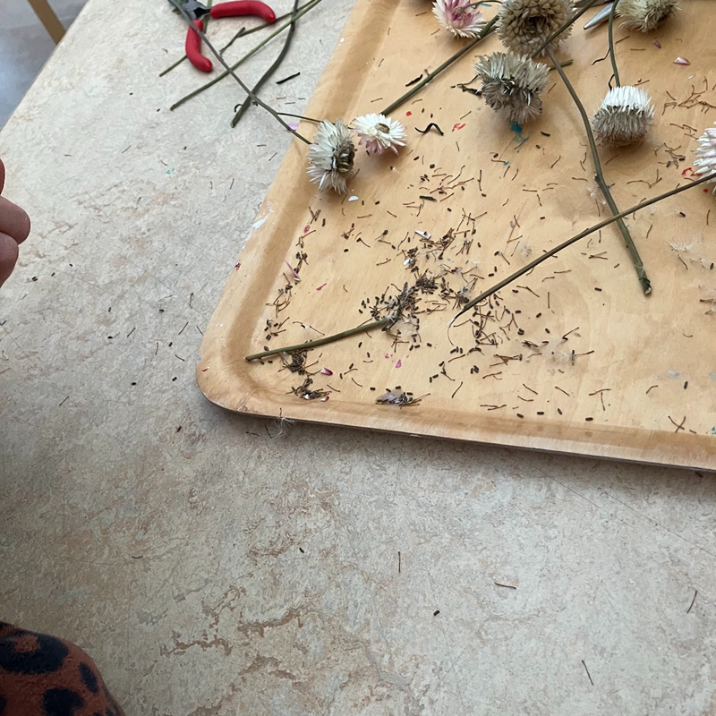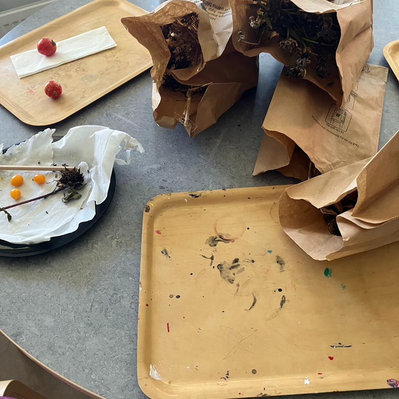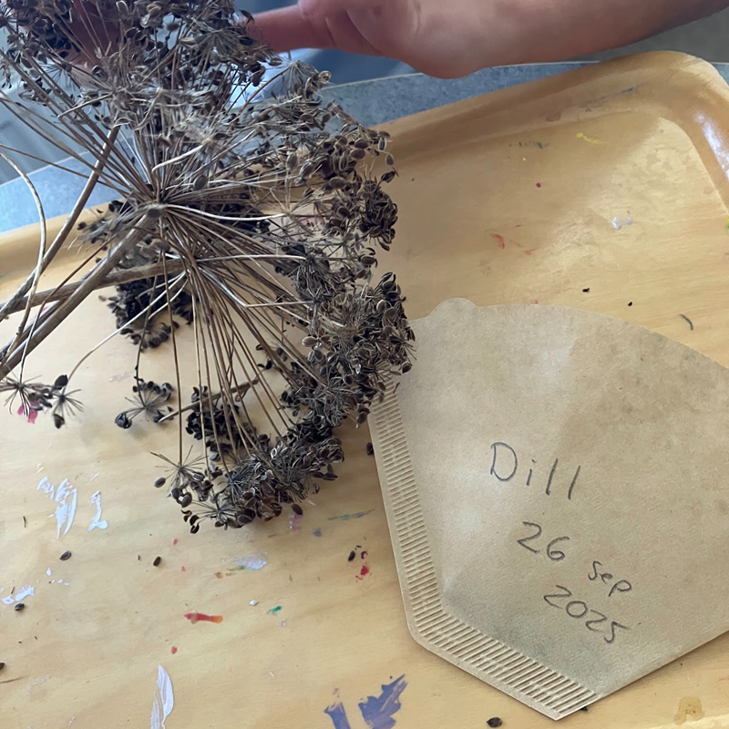 - Olika växter som har vissnat. T ex ringblomma, eternell, dill, kål. Växterna kan förvaras i papperspåsar på torr plats tills det är dags att pilla bort fröerna.